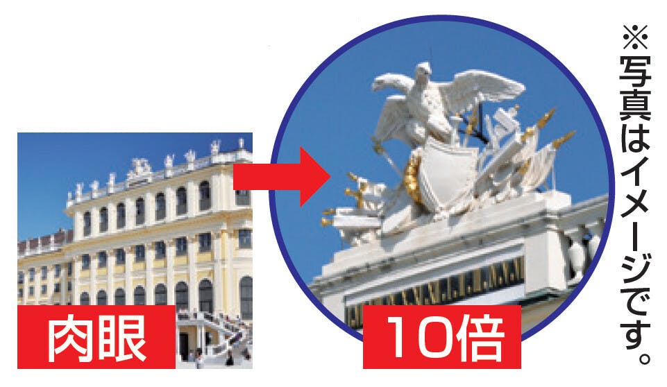 [仕様] ●倍率:10倍 ●対物レンズ有効径:約21mm ●1000m先の視野:約114m ●実視界:約6.5度 ●ひとみ径:約2.1mm ●アイレリーフ:約7mm ●明るさ:約4.4