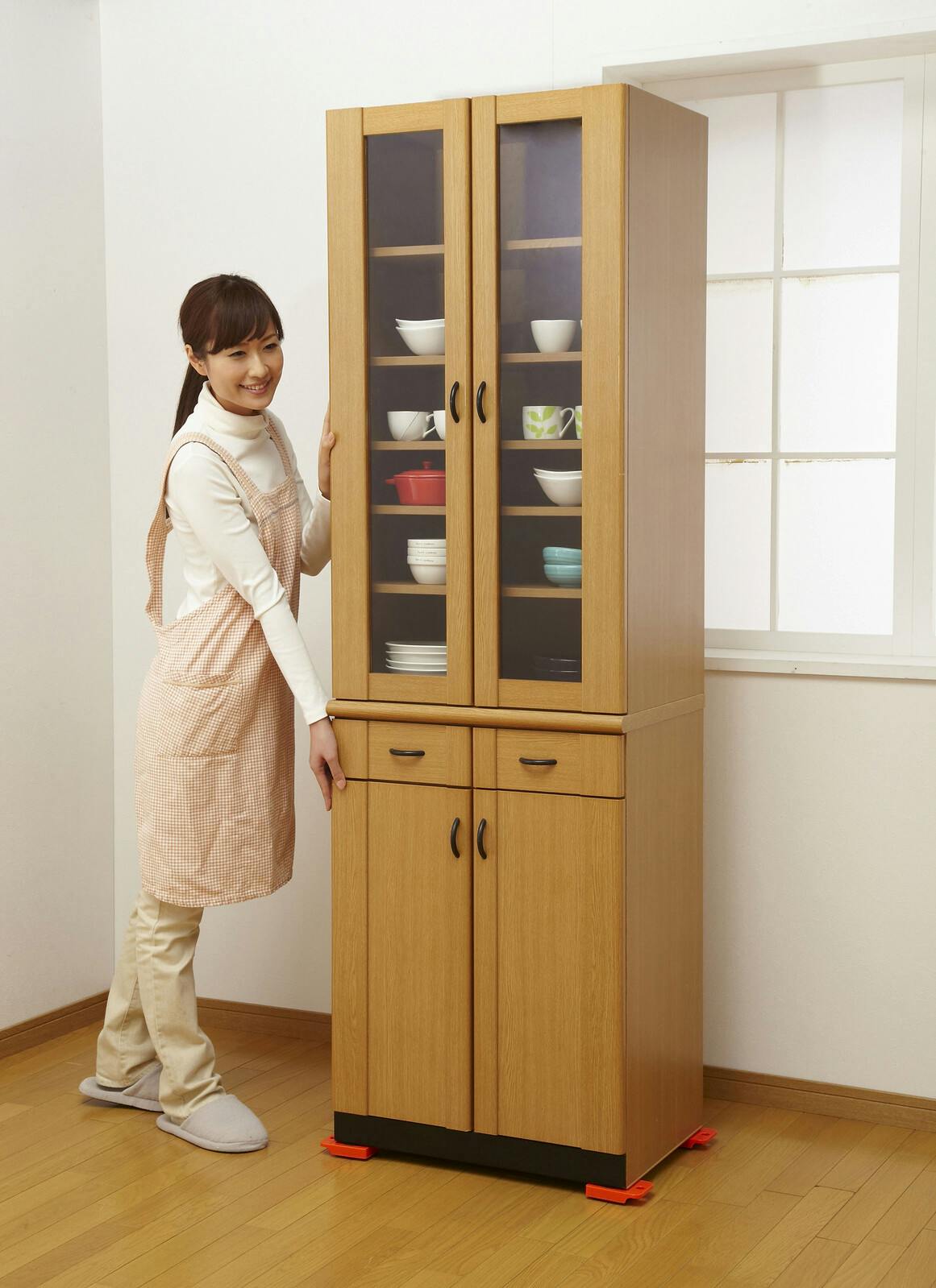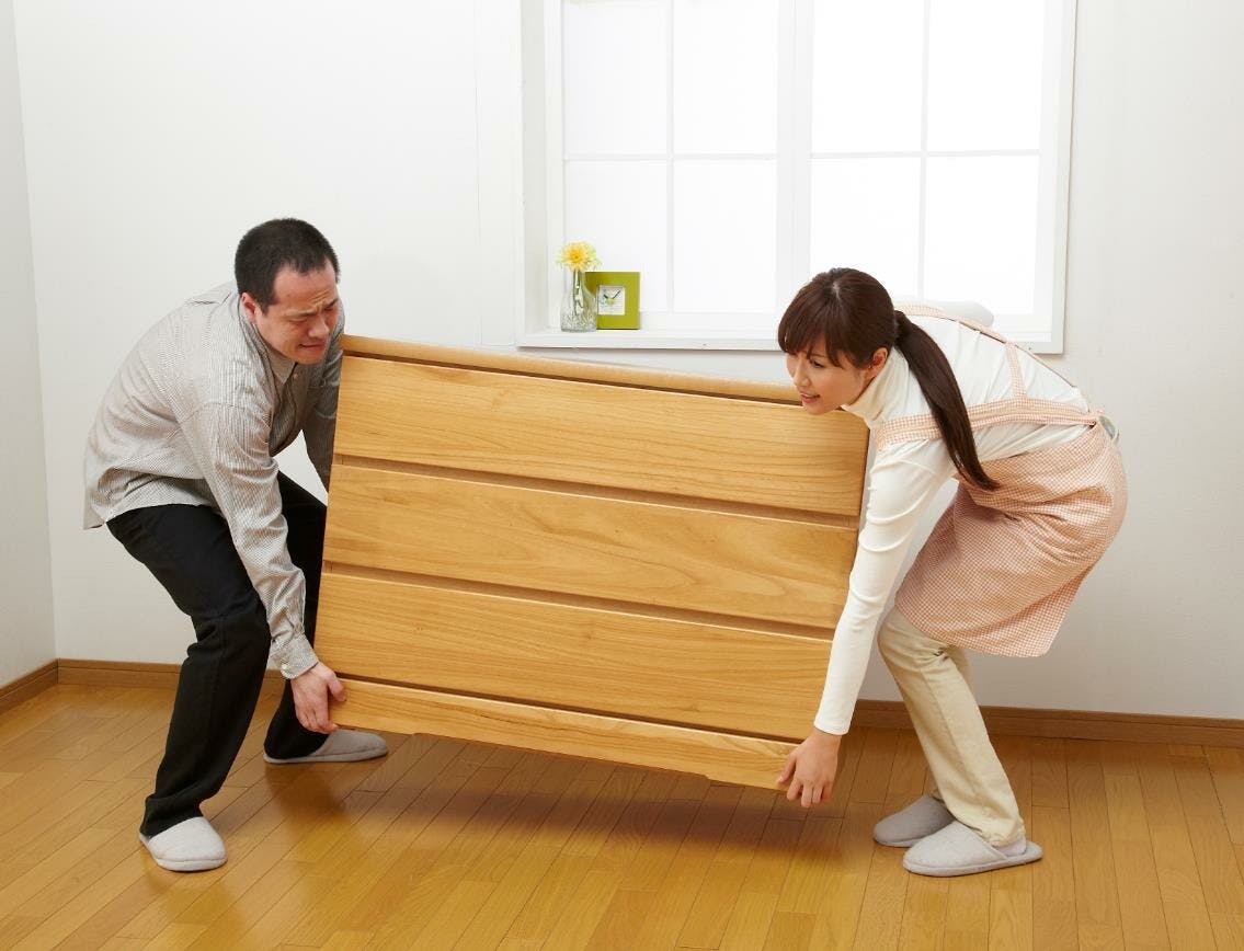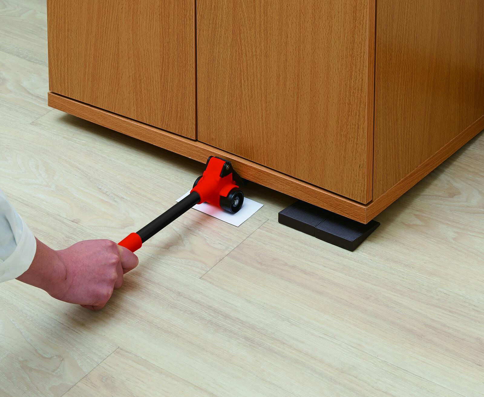 テコの原理で重い家具や家電をラクラク移動。 ●家具の移動は大変…。 ●持ち上げ棒を差し込み、台車を隙間にセット。重い家具もラクラク移動。 ●模様替え・大掃除・引越しなどに ●最大約100kgの物を移動可能