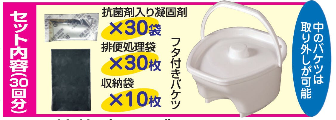 [セット内容] [NEW抗菌ポータブルトイレセット] ポータブルトイレ本体、抗菌剤入り凝固剤×30包、排便処理袋×30袋、収納袋×10枚