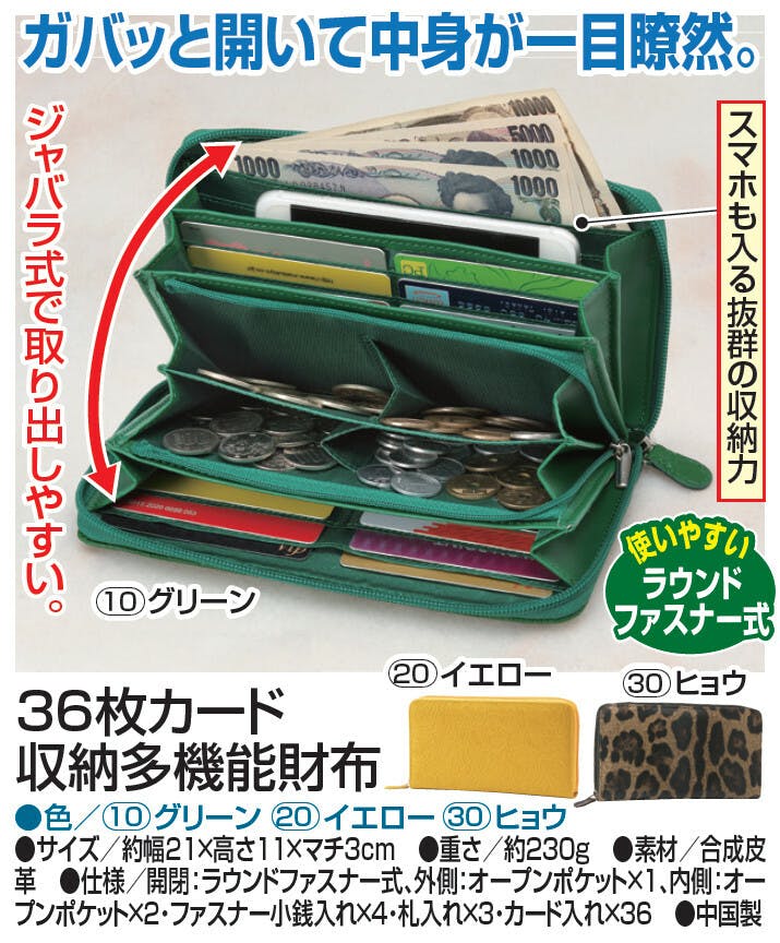 [仕様] ●開閉:ラウンドファスナー式 ●外側:オープンポケット×1 ●内側:オープンポケット×2・ファスナー小銭入れ×4・札入れ×3・カード入れ×36