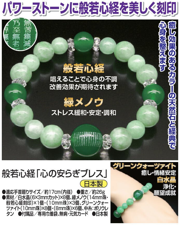 パワーストーンに般若心経を美しく刻印 ●癒し効果のあるカラーの天然石と経典で心身を整えます ●般若心経:唱えることで心身の不調改善効果が期待されます ●緑メノウ:ストレス緩和・安定・調和 ●グリーンクォーツァイト:癒し・情緒安定 ●白水晶:浄化・願望成就
