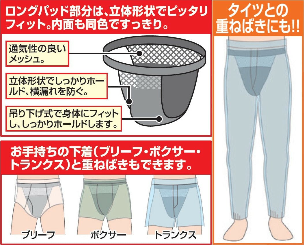 ●通気性の良いメッシュ。立体形状でしっかりホールド、横漏れを防ぐ。吊り下げ式で身体にフィットし、しっかりホールドします。 ●お手持ちの下着(ブリーフ・ボクサー・トランクス)と重ねばきもできます。 ●タイツとの重ねばきにも!