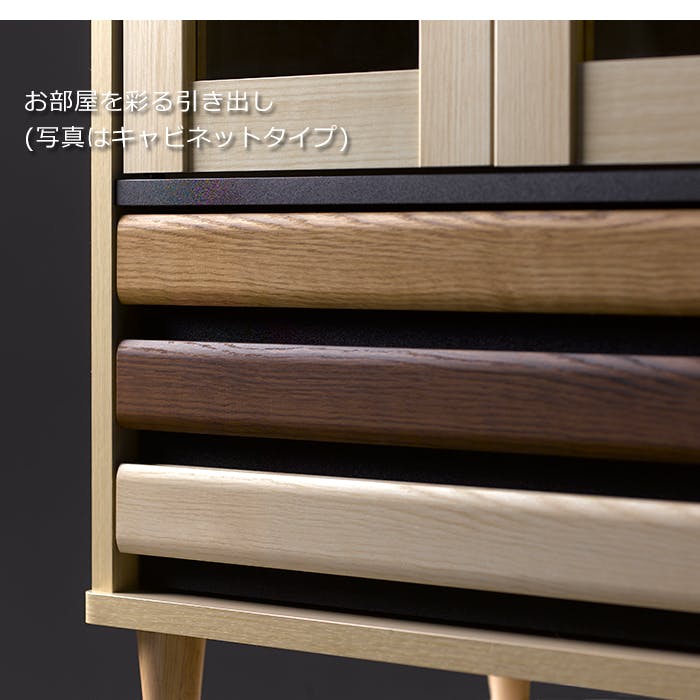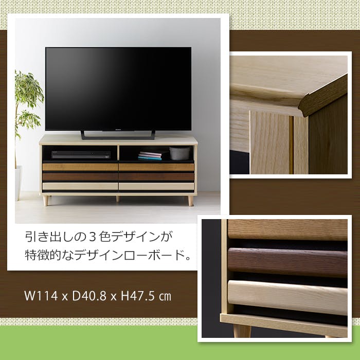 引き出しの3色デザインが目を引くローボード。天然木のような風合いのシートを採用し、お部屋にやさしくなじみます。引き出しはスライドレール仕様で、開け閉めもスムーズ。背面のコード穴は組立時にお客様ご自身でカットしていただく仕様です。 ※推奨TVサイズ~50V