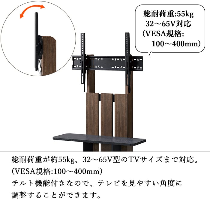 北欧スタイルを取り入れた、インテリア性と機能性を併せ持った壁寄せテレビ台。キャスター付きなので、お掃除などのちょっとした移動にとても便利。(※アジャスター付で固定も出来ます。)金具は前後傾斜が可能なチルト機構付きでTVを鑑賞しやすい角度に調整が可能です。(前傾15°/ 後傾5°)