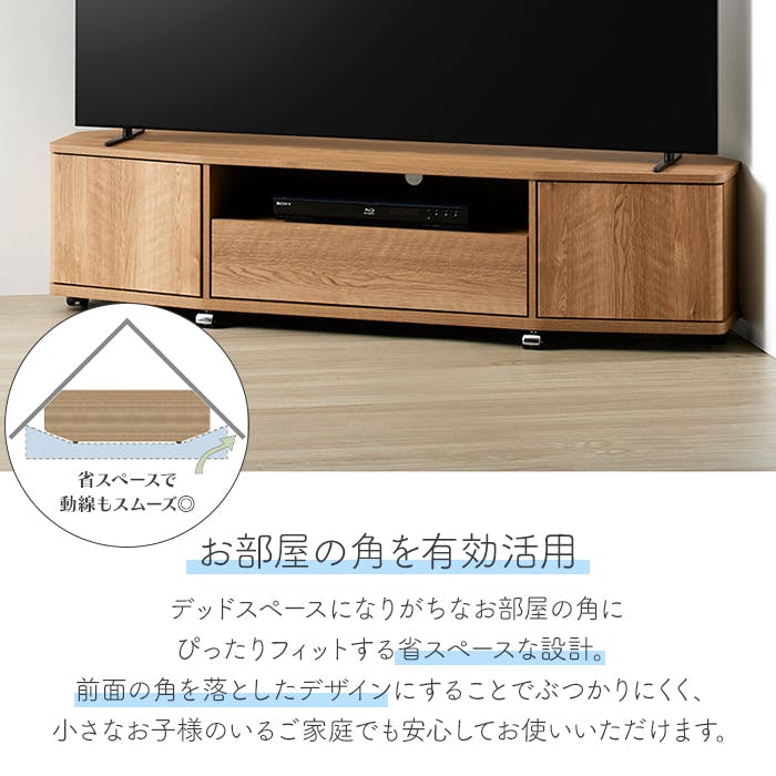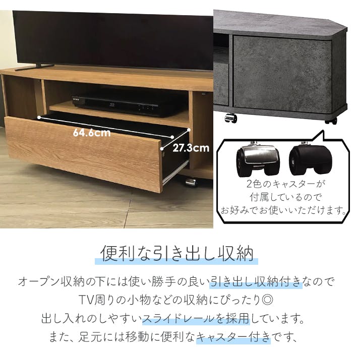 お部屋のコーナーにぴったりフィットし、省スペース化を実現したコーナーテレビ台。キャスター付きで移動ができ、背面の掃除や配線作業がラクラク。スライドレール式の引出しと両サイドの扉収納部で、テレビ周りの小物やHDDなどをまとめて収納できます。前面のキャスターは、シルバーかブラックのお好きな方を取り付けられます。天然木のような質感高いナチュラル色と、モダンで高級感のある石目調(モルタル調)の2色からお選びいただけます。