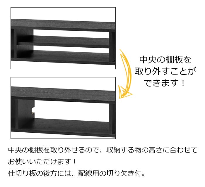 ちょっと欲しい収納スペースを手軽にプラスできるテレビ台。テレビやパソコンの高さを少し上げたい時に便利で、買い足したHDDや周辺機器もすっきり収納できます。単品のテレビ台としても使用可能な多用途設計です。中央部の棚板は取り外しができます。 ■対応TVサイズ:~49V