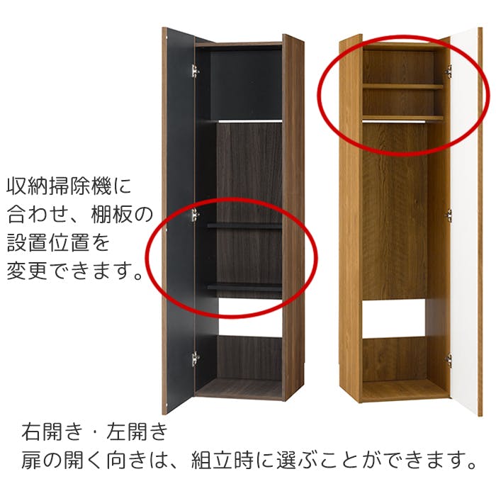 ステッククリーナー、キャニスター掃除機をすっきり収納。収納力も抜群でお掃除用品や小物類もまとめて収納出来ます。(収納掃除機に合わせて棚板の設置位置を変更可能 可動棚2枚)ダイソンコードレスクリーナー、収納ブラケット用穴加工済み。その他商品は市販のフックを取り引けて使用出来ます。扉は左右開きを組立時に選択可。壁にぴったり出来る巾木避け加工や配線を後板の後ろから通せたり、コンセント用開口部ありと便利な機能が沢山! ※ダイソンV10、V11は設置不可となります。ご了承ください。