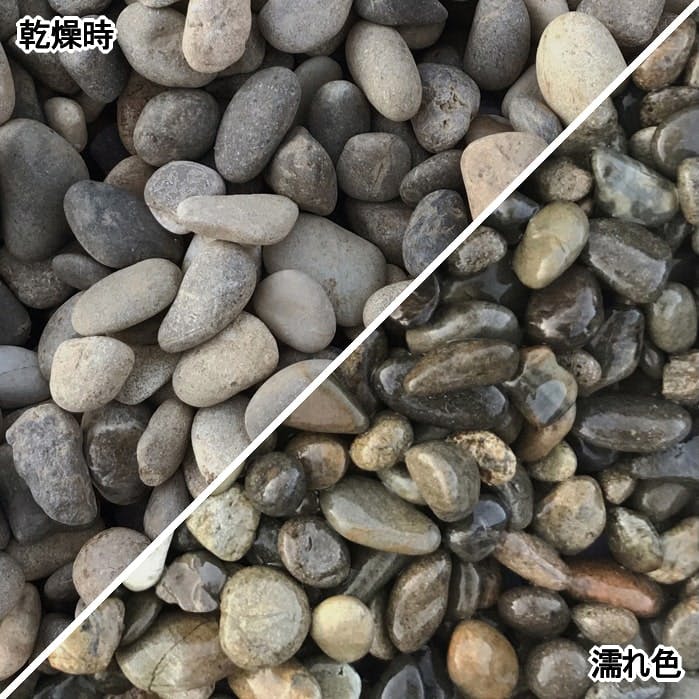 ●発送効率化と資源削減のため、丈夫なPE袋に直接送り状を貼る簡易梱包でお届けします。●天然の自然玉砂利のため色調・サイズにバラツキがあり、表示寸法は選別時の網目サイズに基づくため袋ごとに若干異なる場合があります。●海岸で採石し水洗い後に袋詰めしているため、湿った状態で届くことがありますが品質に問題ありません。●使用量の目安は1平米あたり厚み3cmで約48kg、4cmで約64kg、5cmで約80kgですが、敷き方により増減します。天然素材の特性と簡易梱包へのご理解をお願いいたします。