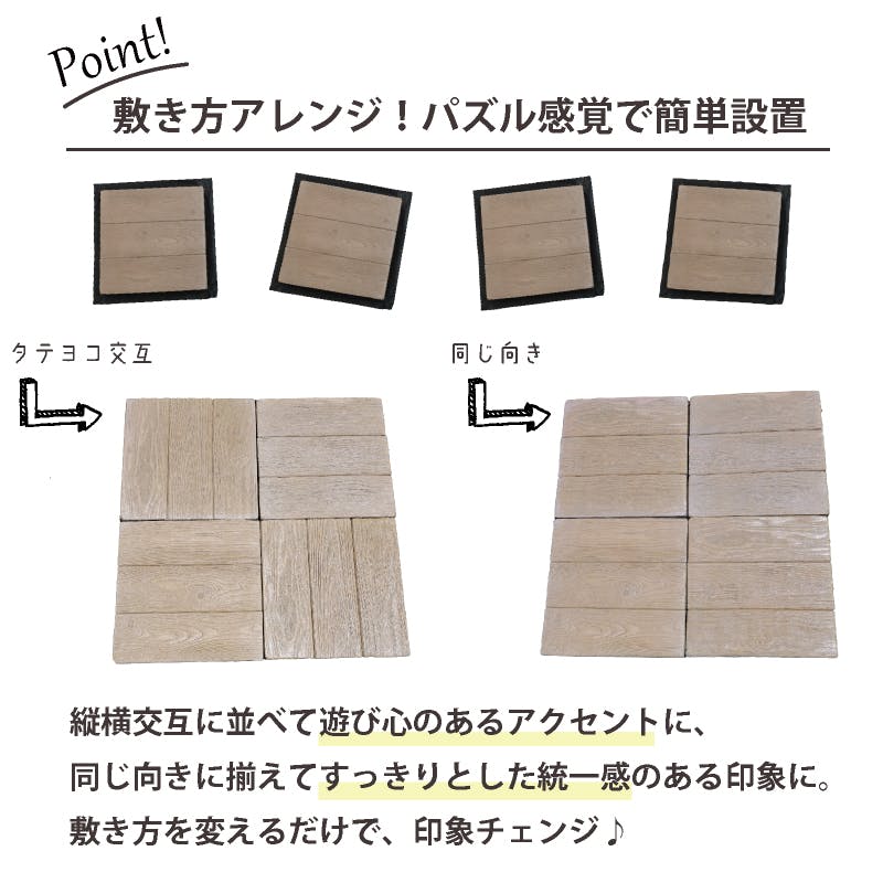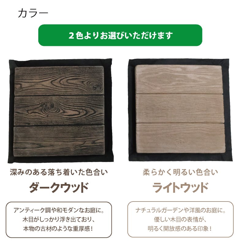 本物の木目を型で再現したコンクリート製のタイル。 優しい木の雰囲気に癒されつつコンクリート製ですので重厚感もある舗石です。さらに裏面には防草シートを付け四方に継ぎしろもありますので簡単に並べることができます タイルとの間は砂利を敷くとさらに雑草対策にもなります。