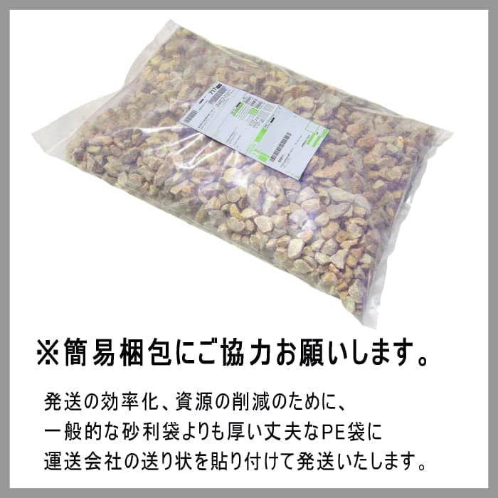 ●簡易梱包への協力のお願いとして、丈夫なPE袋に送り状を直接貼り付けて発送いたします。●天然石のため色調や形・大きさにバラツキがあり、ふるい選別のため袋ごとに若干寸法が異なることがあります。●使用量の目安は1平米あたり、厚み3cmで約48kg、4cmで約64kg、5cmで約80kgです。砂利の敷き方や厚みにより必要量は増減しますので、あくまで目安としてください。