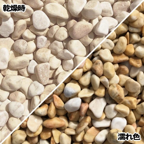 ●天然石のため色調や形・大きさにバラツキがあります。砂利は石を割り角を落として製造しており、ふるい選別のため袋ごとに若干寸法が異なることがあります。●使用量の目安は1平米あたり、厚み3cmで約48kg、4cmで約64kg、5cmで約80kgです。砂利の敷き方や厚みにより必要量は増減しますので、あくまで目安としてください。