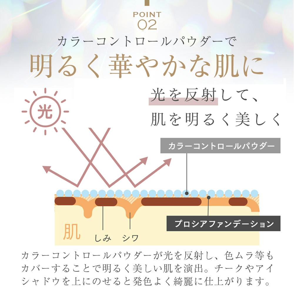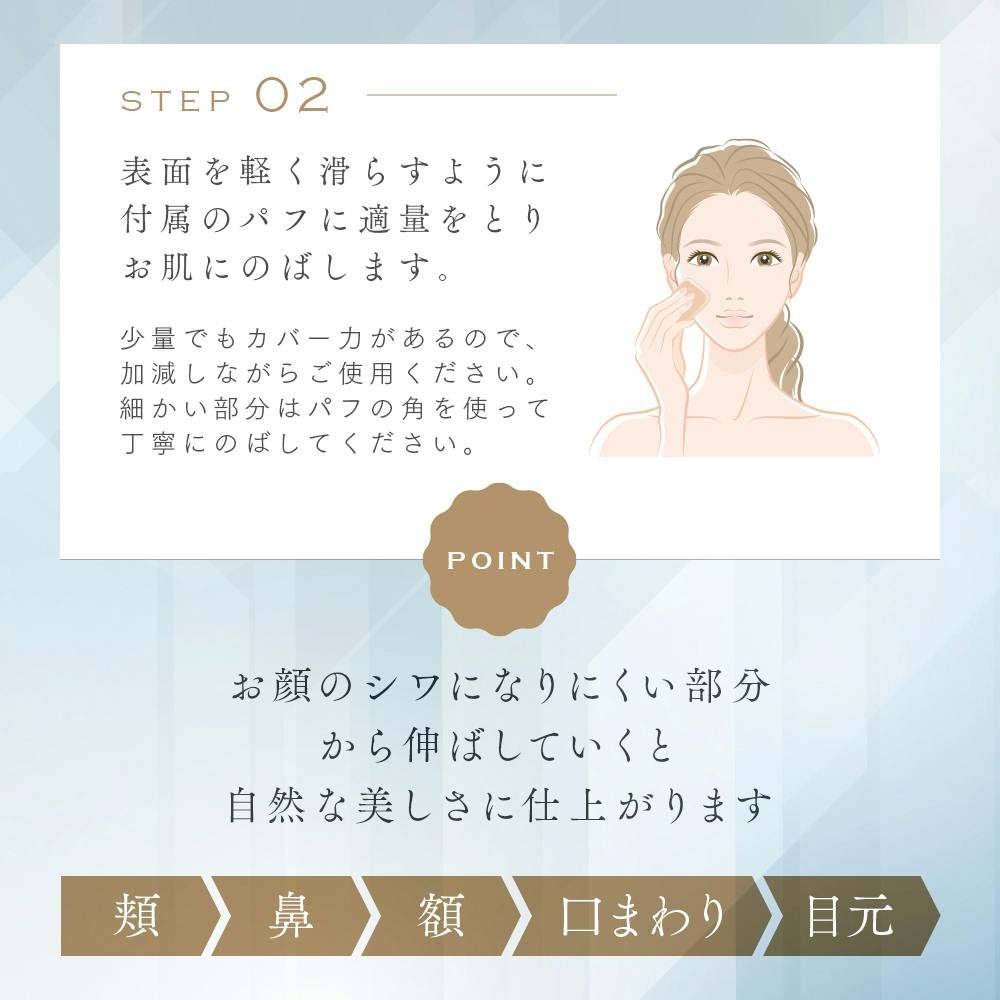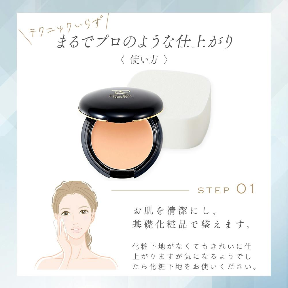 1)「プロシア」を指先にとり、気になる部分にトントンとたたくようになじませます。2)「スポンジパフ」に「プロシア」を軽く含ませ上からなじませます。(個人差によりカバー効果が十分に現れないことがございます。)外出中のお化粧直しにはコンパクトに入れて使用する「携帯パフ」をご使用ください。