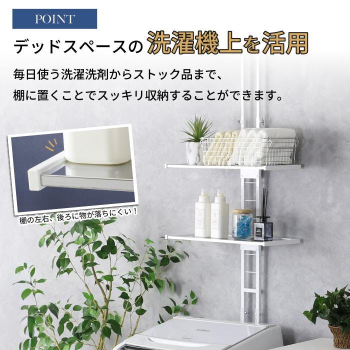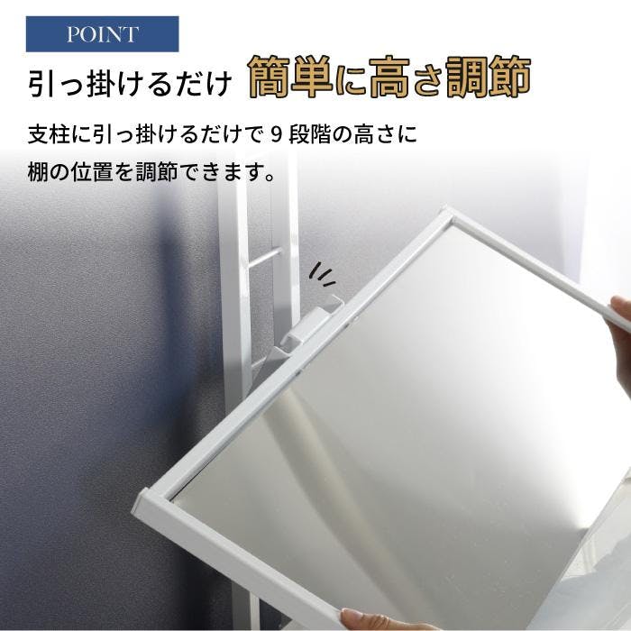 お手入れが簡単なステンレス天板のランドリーラックです。スリムな支柱で見た目もスッキリ!棚は9段階の高さに変更でき、お使いの洗濯機の高さに合わせてなど位置を調整できます。