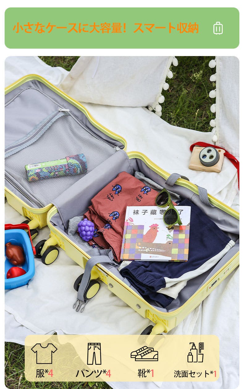 子供専用に設計されたキャリーケースで、家族旅行や国内旅行に最適です