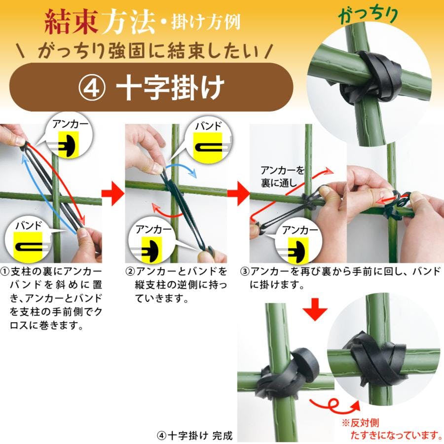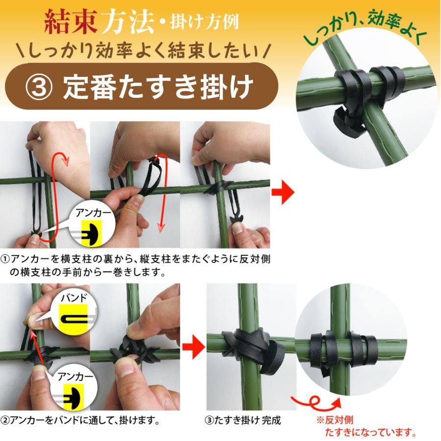 〇クルッと巻いて掛けるだけ、素早く、楽らく作業 〇伸び縮みするから、作物に優しく誘引、支柱はしっかり結束 〇直射日光、雨、風に強い素材(EPDM) 〇農作業以外の結束にも様々な用途で活躍
