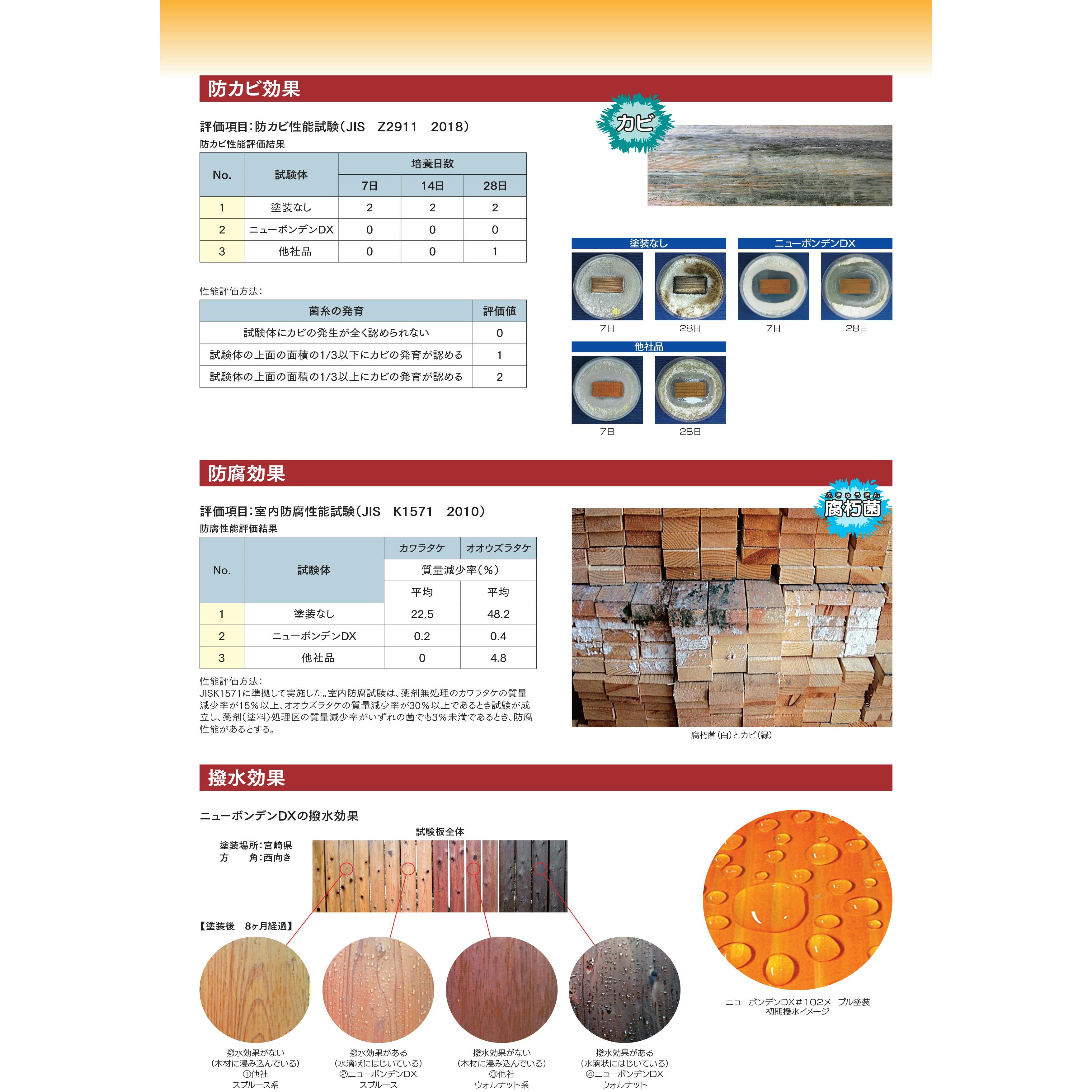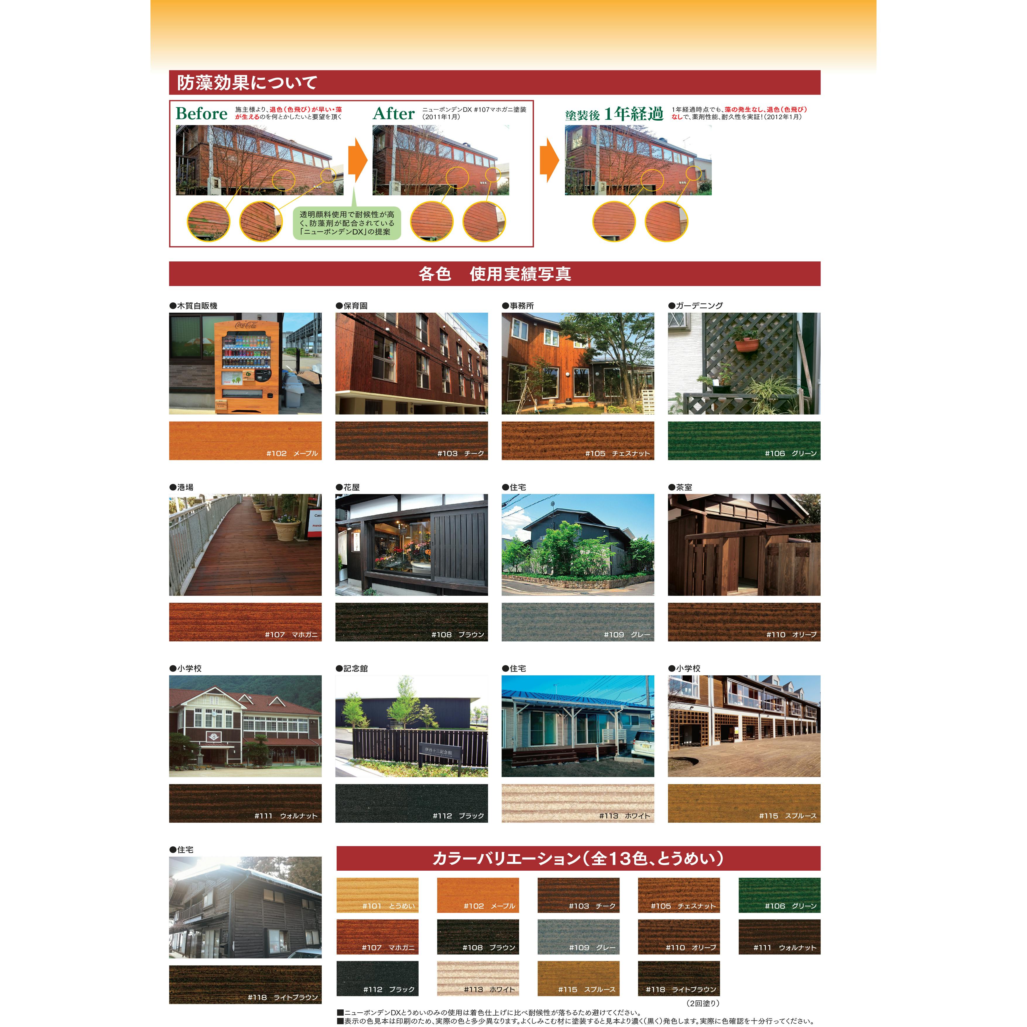 透明度の良い微粒子顔料を使用しているため、着色力が高く、仕上がりが鮮明です。そのため、木材本来の持ち味を生かした高級感あふれる仕上がりが得られます。特殊な顔料、防虫防腐剤、撥水剤、防蟻剤、防藻剤などを配合。様々な気候条件にも負けない強靱な浸透性塗膜を形成し、長期間木材を保護します。余分な塗膜をつくらないので、塗り替えの時にゴミやカビ等の汚れを取り除くだけで再塗装ができます。天然植物油を使用しており、刺激の強い有機溶剤臭、薬剤臭をおさえています。