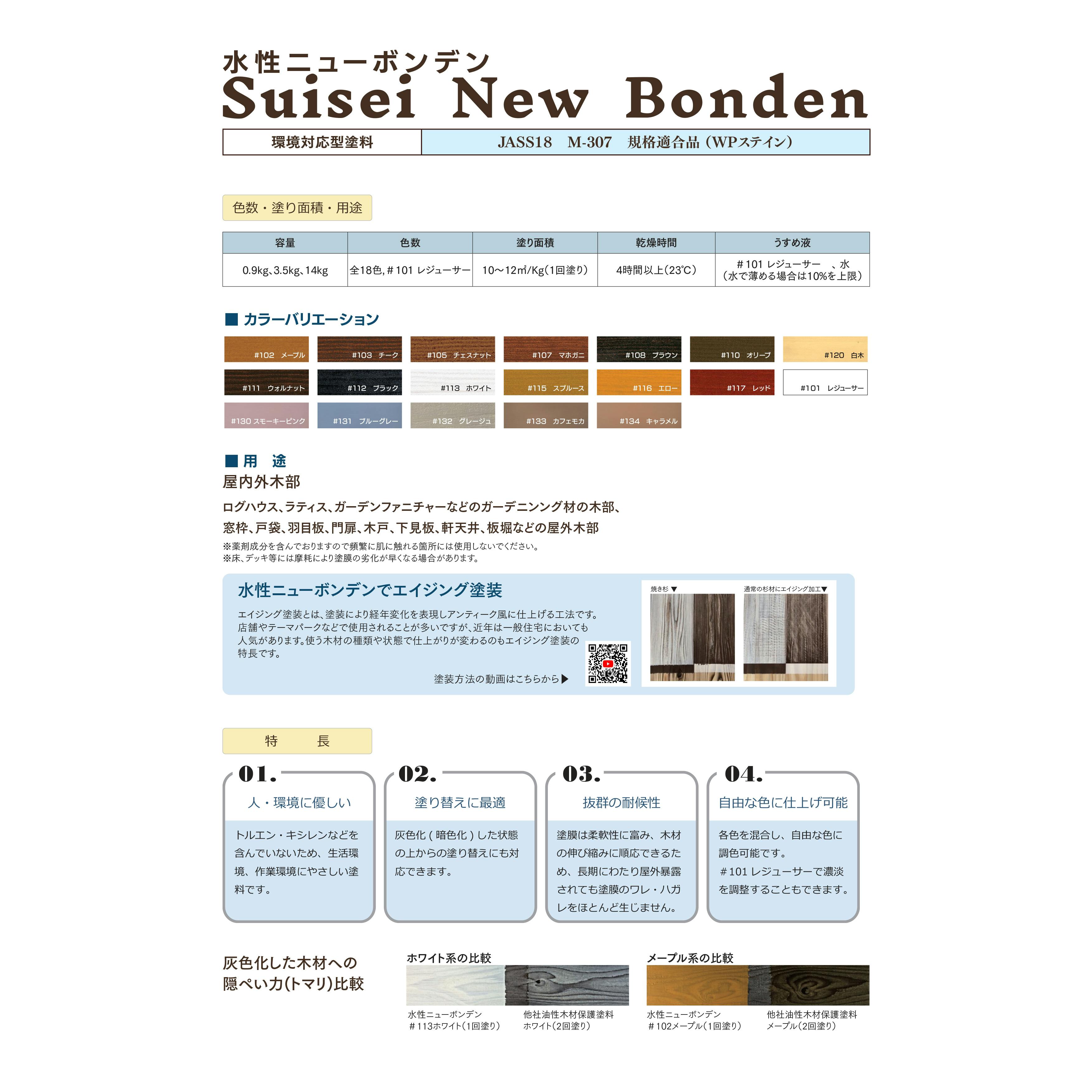 ・食器棚、玩具、動物小屋、温室等や、頻繁に肌の触れる箇所へは使用しないで下さい。・スプレー塗装は避けて下さい。・気温5℃以下、湿度の高い時(85%以上)、木材の含水率が高い場合は塗装できません。・マツ、杉などの吸い込みムラや塗りつぎムラが出やすい針葉樹や材質の柔らかい木材に塗装する場合は、ニューボンデンガーデンカラー「とうめい」を下塗りしてから上塗りしてください。・「レジューサー(とうめい)」のみの外部単独への使用は耐侯性が落ちるため避けてください。