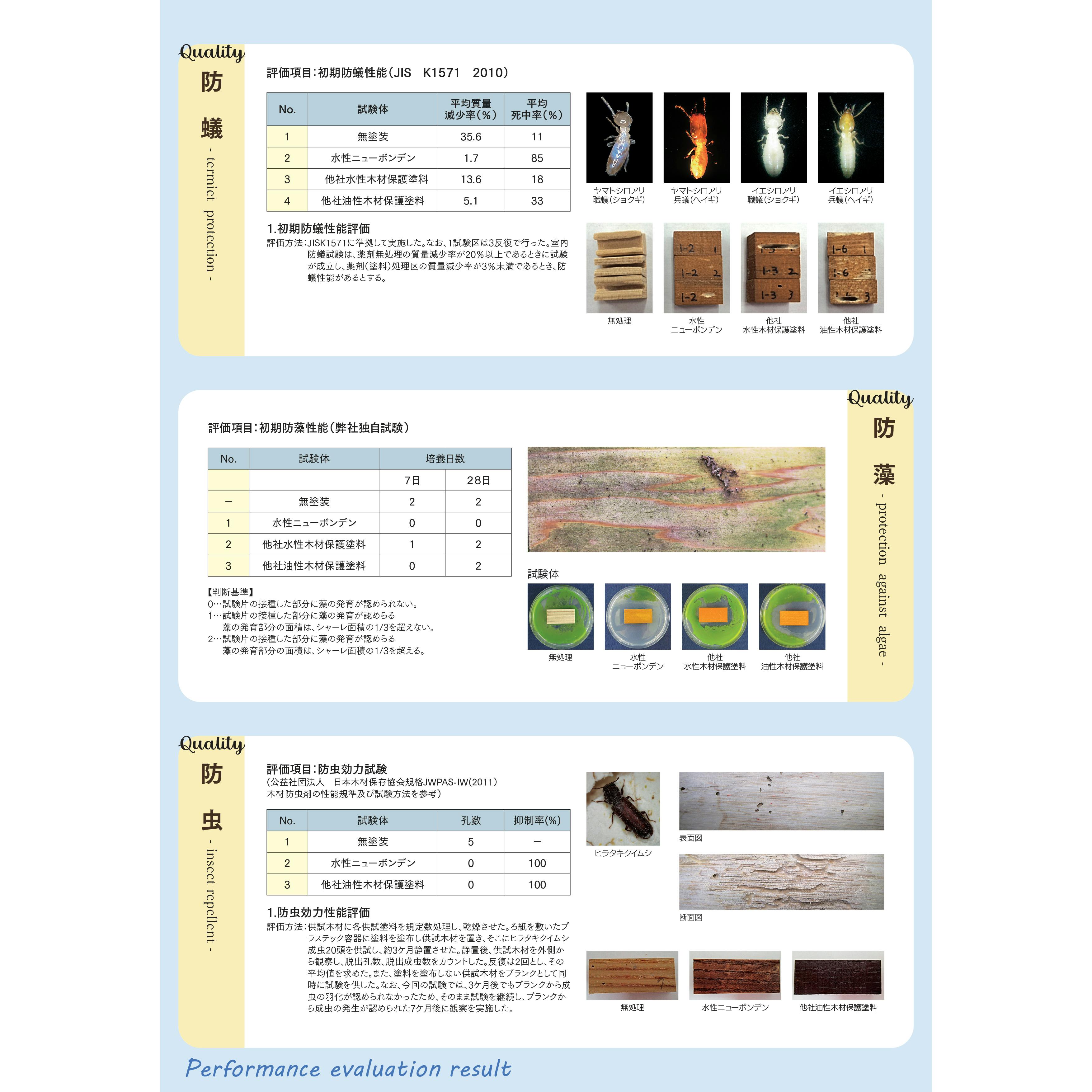 トルエン・キシレンなどを含んでいないため、生活環境、作業環境にやさしい塗料です。灰色化(暗色化)した状態の上からの塗り替えにも対応できます。塗膜は柔軟性に富み、木材の伸び縮みに順応できるため、長期にわたり屋外暴露されても塗膜のワレ・ハガレをほとんど生じません。各色を混合し、自由な色に調色可能です。「レジューサー(とうめい)」で濃淡を調整することもできます。また、1回塗り仕様で工期短縮が可能です。
