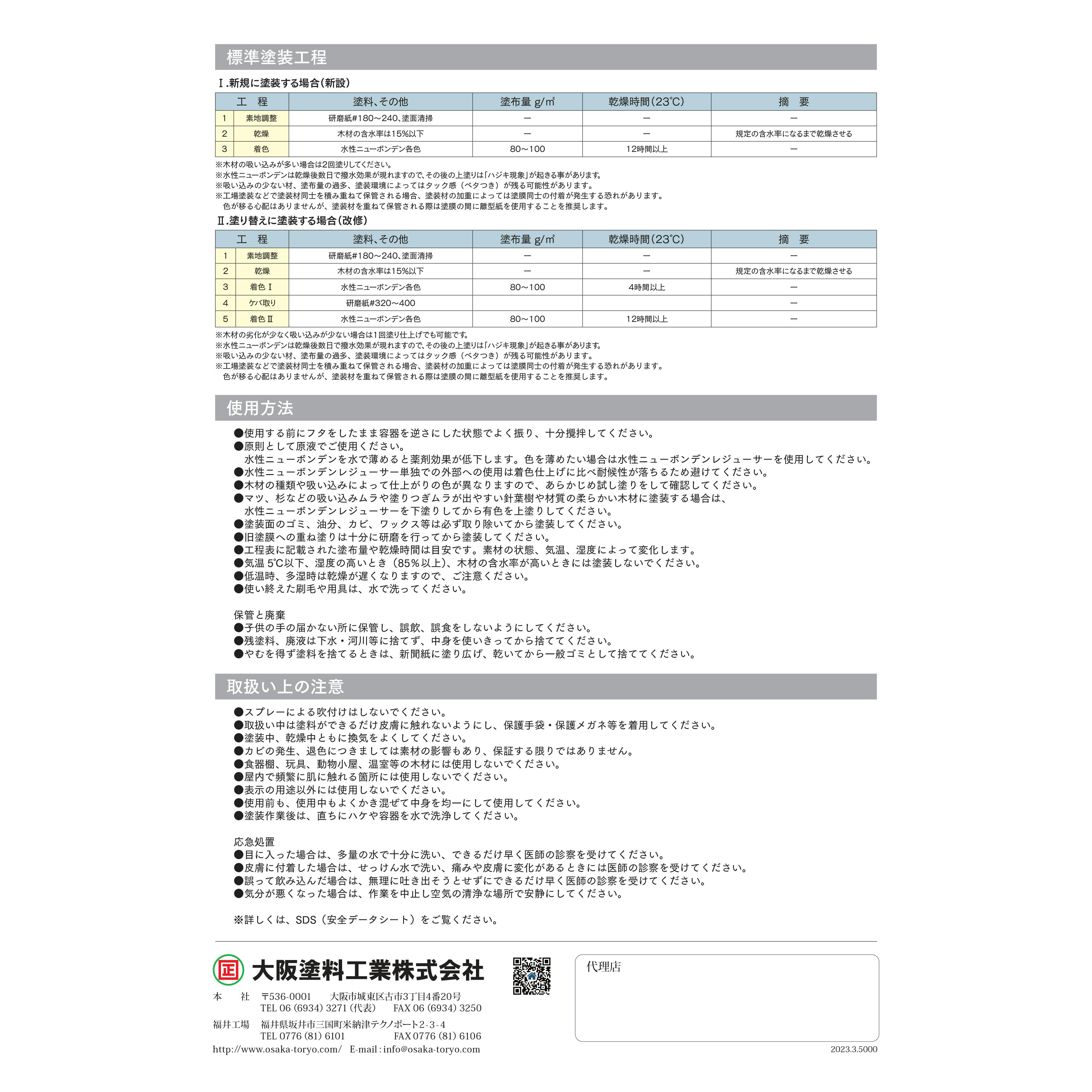 ・食器棚、玩具、動物小屋、温室等や、頻繁に肌の触れる箇所へは使用しないで下さい。・スプレー塗装は避けて下さい。・気温5℃以下、湿度の高い時(85%以上)、木材の含水率が高い場合は塗装できません。・マツ、杉などの吸い込みムラや塗りつぎムラが出やすい針葉樹や材質の柔らかい木材に塗装する場合は、ニューボンデンガーデンカラー「とうめい」を下塗りしてから上塗りしてください。・「レジューサー(とうめい)」のみの外部単独への使用は耐侯性が落ちるため避けてください。