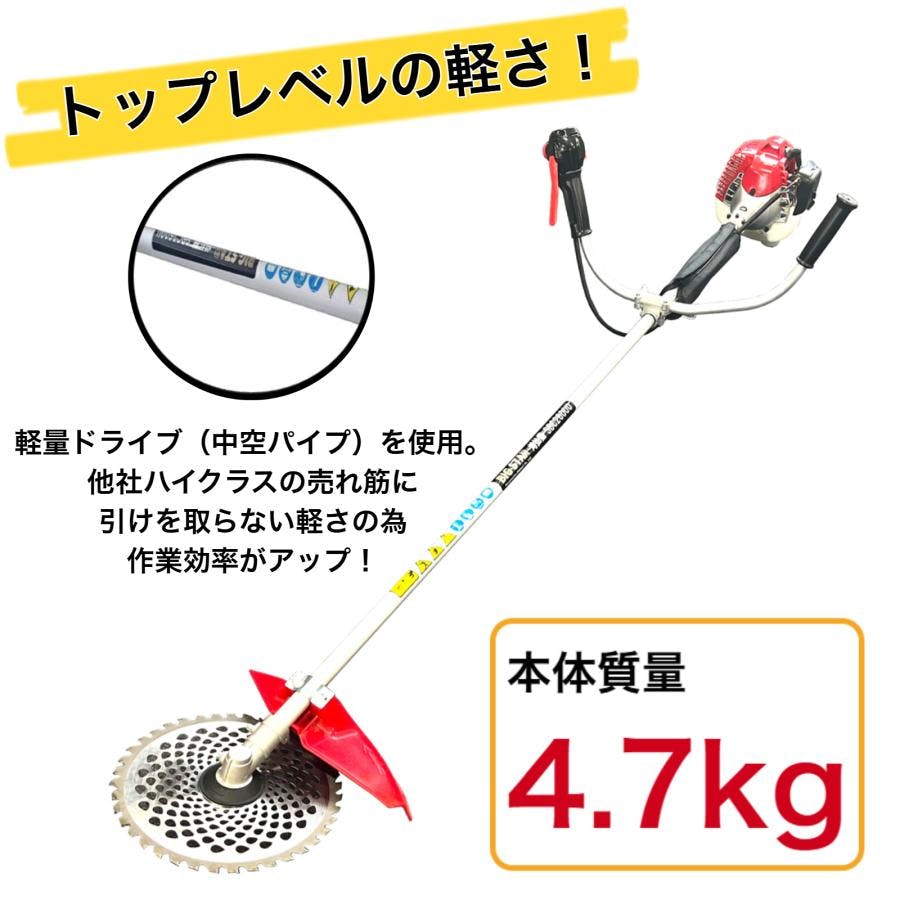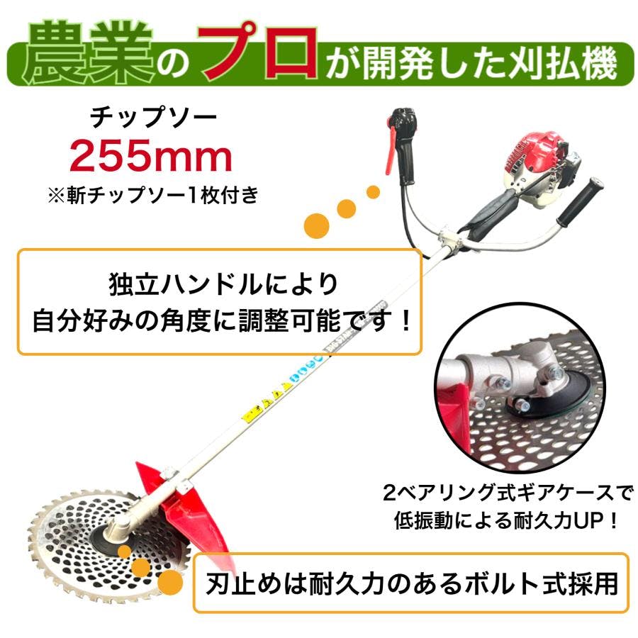 エンジン式(26CC):2サイクル タンク容量:0.6L 本体サイズ:1,740mm×590mm×450mm 本体重量 :4.7 kg チップソー :255 mm(1枚付属)