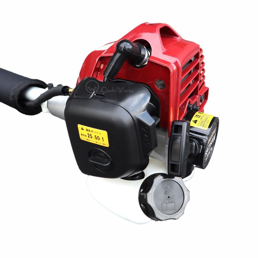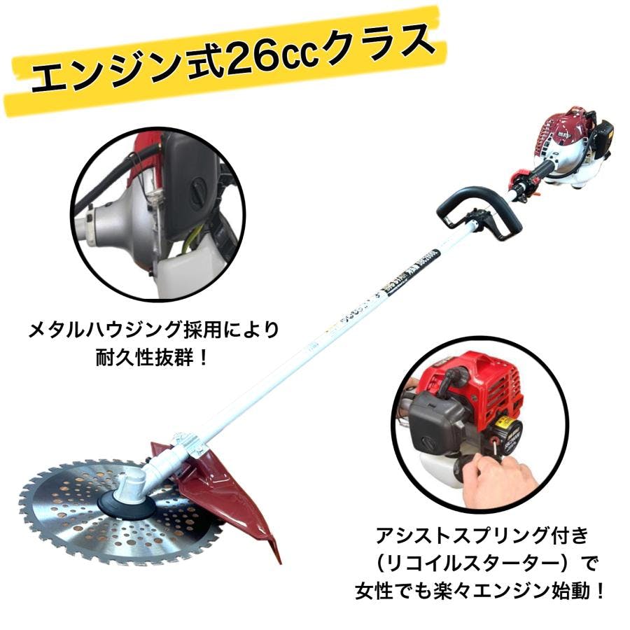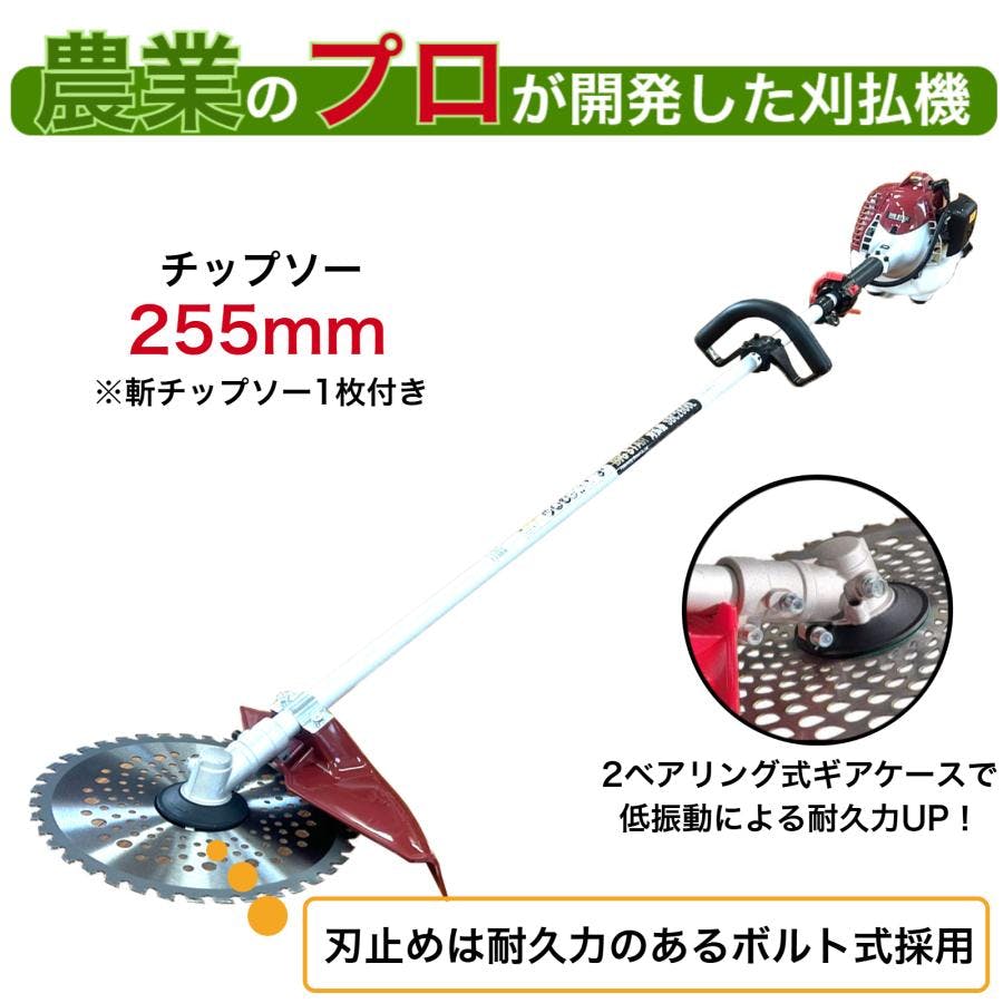 エンジン式(26CC):2サイクル タンク容量:0.6L 本体サイズ:1,740mm×590mm×450mm 本体重量 :4.7 kg チップソー :255 mm(1枚付属)
