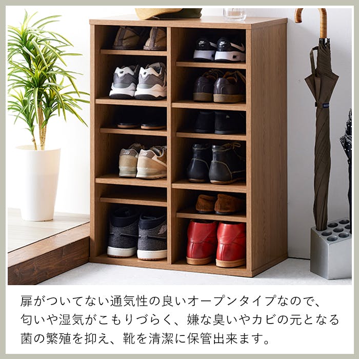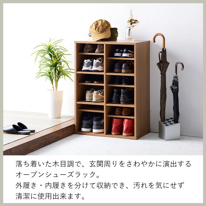 オフィス空間の顔となる玄関周りを落ち着いた木目調でさわやかに演出出来るオープンシューズラック。外履き・内履きを分けて収納でき、汚れを気にせず清潔に使用出来ます。扉が付いてないオープンタイプなので、匂いや湿気がこもりづらく嫌な臭いやカビの元となる菌の繁殖も抑え清潔に保管出来ます。可動棚は3.2cm間隔で6段階の調整が可能。履物に合わせて調節できます。外履き6足、内履き6足を収納できます。