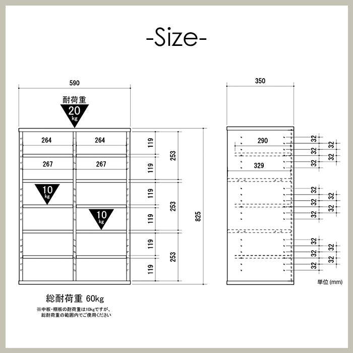 ■[本体]幅59×奥行35×高さ82.5cm ■[各収納部内寸] 幅26.7×奥行33.3×高さ25.3cm ■[固定棚] 幅26.7×奥行32.9×高さ1.5cm×4枚 ■[可動棚] 幅26.4×奥行29×高さ1.5cm×6枚