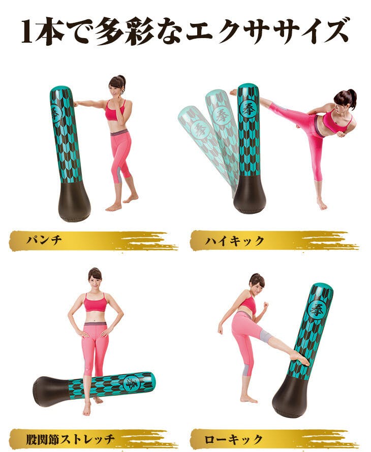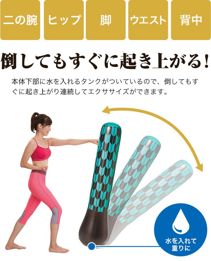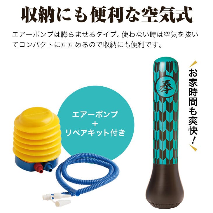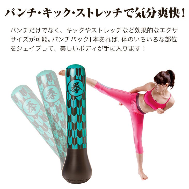 ストレス解消パンチバッグ。パンチ・キック・ストレッチで気分爽快! ●倒してもすぐに起き上がる! ●収納にも便利な空気式! ●パンチだけでなく、キックやストレッチなど効果的なエクササイズが可能。 ●セット内容:本体、エアーポンプ、リペアキット、取扱説明書 ●一部組立式