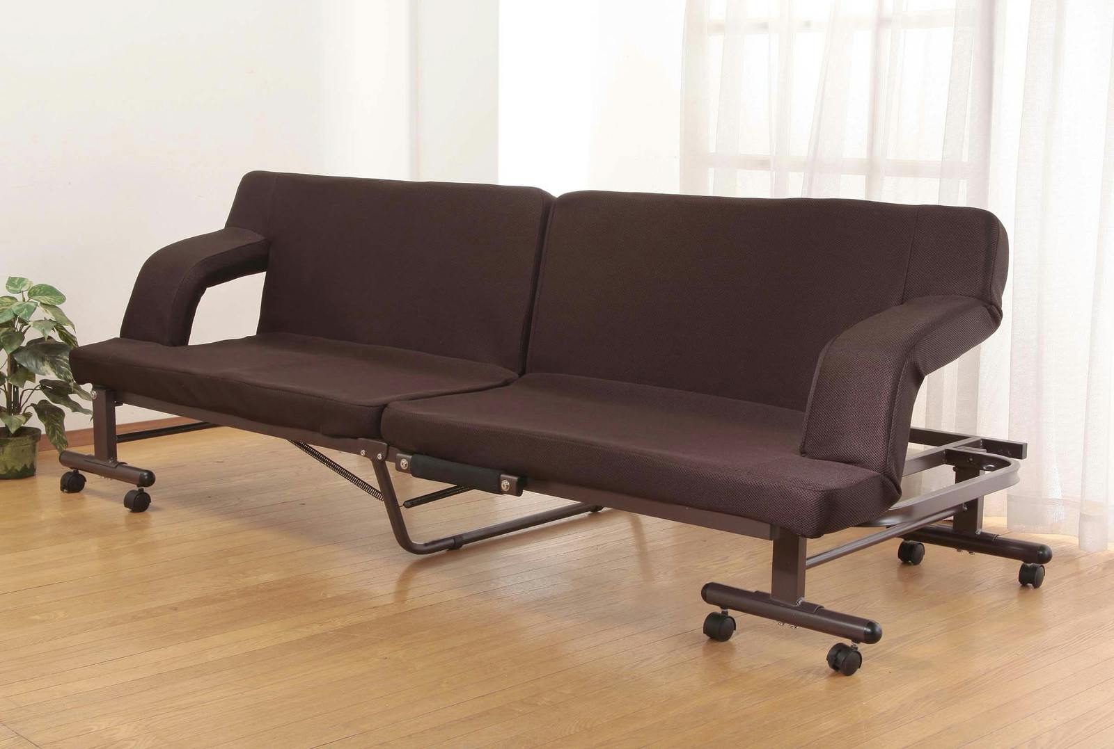 14段階リクライニング、ソファ使用時は肘掛け付きで便利。 折りたたんでコンパクトに収納。キャスター付きで移動ラクラク。張り地には熱や湿気がこもりにくく、肌ざわりの良いメッシュ素材を採用。