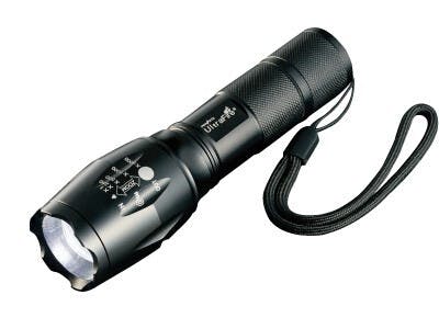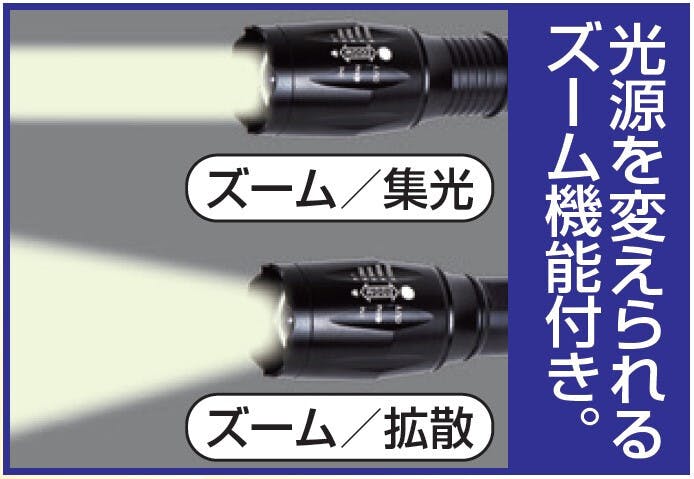 驚きのパワー!遠くまで照らすLEDライト。 ●色/ブラック ●LEDは世界最高クラスのCREE社製「T6」採用。世界の軍隊・警察機関で使用される強力ライト。 ●約300m強力照射! ●非常時大活躍! ●5種類の点灯パターン:強・中・弱・点滅・SOS ●光源を変えられるズーム機能付き。ズーム/集光・ズーム/拡散 ●防滴仕様 ※強力な光のため、光源を直接見ないでください。