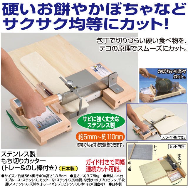硬いお餅やかぼちゃなどサクサク均等にカット! ●包丁で切りづらい硬い食べ物を、テコの原理でスムーズにカット。 ●サビに強く丈夫なステンレス製 ●約5mm~約110mmの幅で切る寸法を調整できます。 ●ガイド付きで同幅連続カット可能。 [写真の説明] (1枚目)イメージ画像 (2枚目)かぼちゃも楽々カット。 (3枚目)スライド板付き。 (4枚目)セット内容(トレー、のし棒) (5枚目)商品画像(本体) (6枚目)商品説明