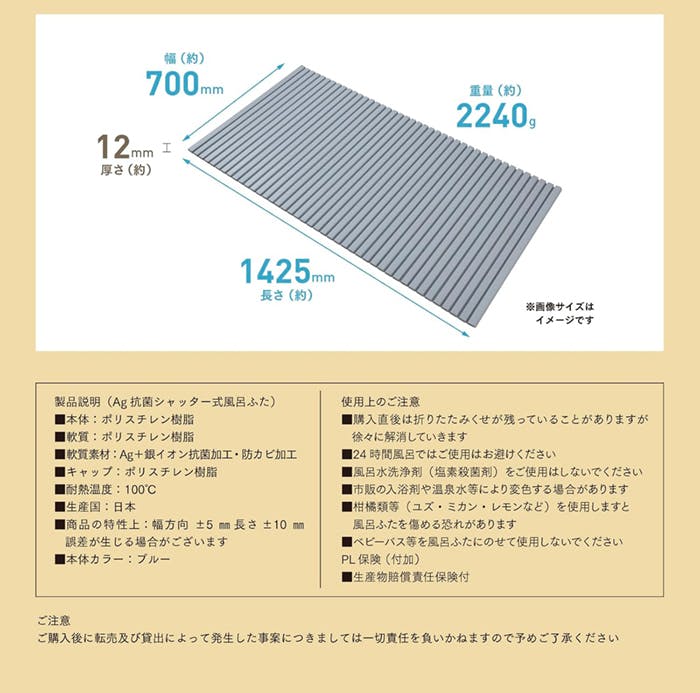 銀イオン抗菌加工・防カビ加工を施した、シャッター式の風呂フタ。お子様やお年寄りにも優しい軽量タイプで、軽い力でくるくると巻いたり開いたりできます。お手入れも簡単!やわらかいスポンジや中性の浴室用洗剤を使用して、溝に沿って軽く洗って水を流せばお掃除完了。くるくる丸めてコンパクトに収納できます。※製品の特性上、実際の寸法は若干の誤差が生じる場合がございます。