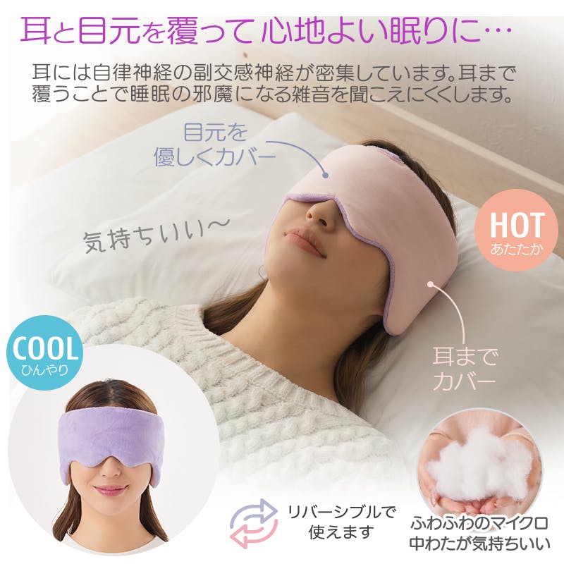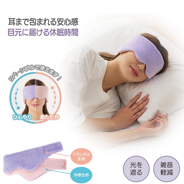 【耳までつつむ リバーシブルアイマスク】 ちあふる あったかフランネルと接触冷感Q-MAX0.38のリバーシブル。耳まで包む大判サイズで安心感と快眠をサポート。マイクロわたの雲のような着け心地。男女兼用サイズ調節可能。丸洗いOKで清潔。安眠 快眠グッズ ギフト JAN:4571414695763