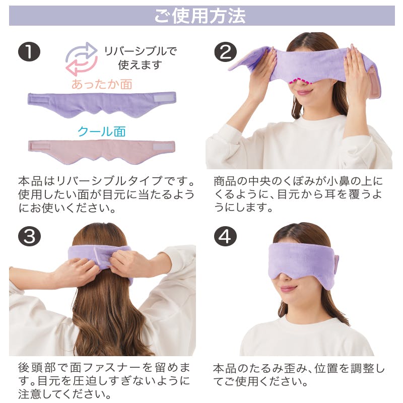 1.リバーシブルタイプです。使用したい面が目元に当たるようにお使いください。2.中央のくぼみが小鼻の上にくるように装着し耳まで覆います。3.後頭部で面ファスナーを留めます。