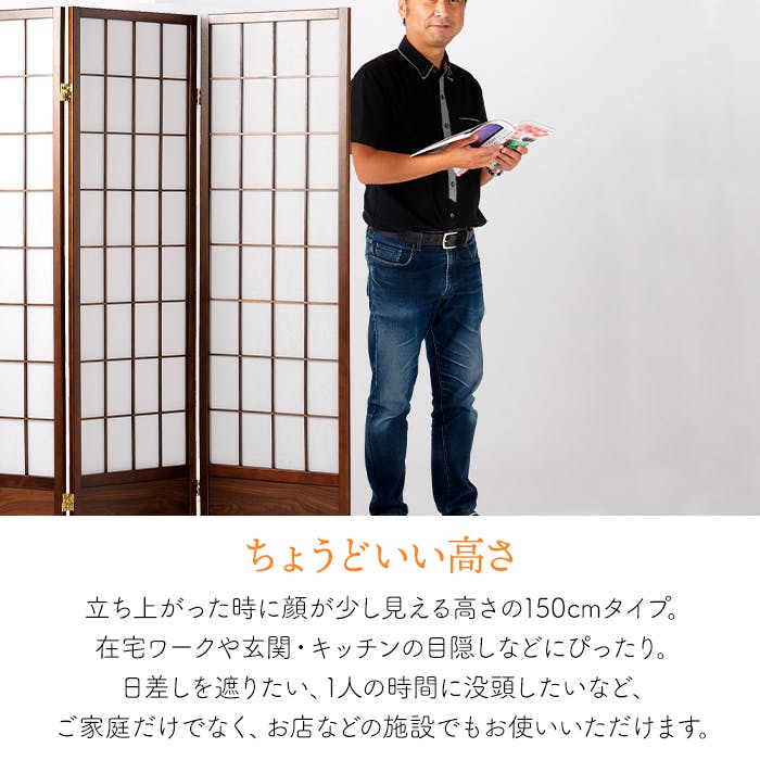 本体下部に幕板が付いた、おしゃれな和風衝立。お部屋の間仕切りやパーテーションにちょうどいい高さ150cmの衝立です。360度開閉可能な両つがい丁番を使用しているので、どちら側にも折り畳むことができます。障子部分は不織布を使用しているので破れにくく、程よい光を通してくれます。使わないときは厚さ約6.5cmに折りたためるので、収納場所も取りません。
