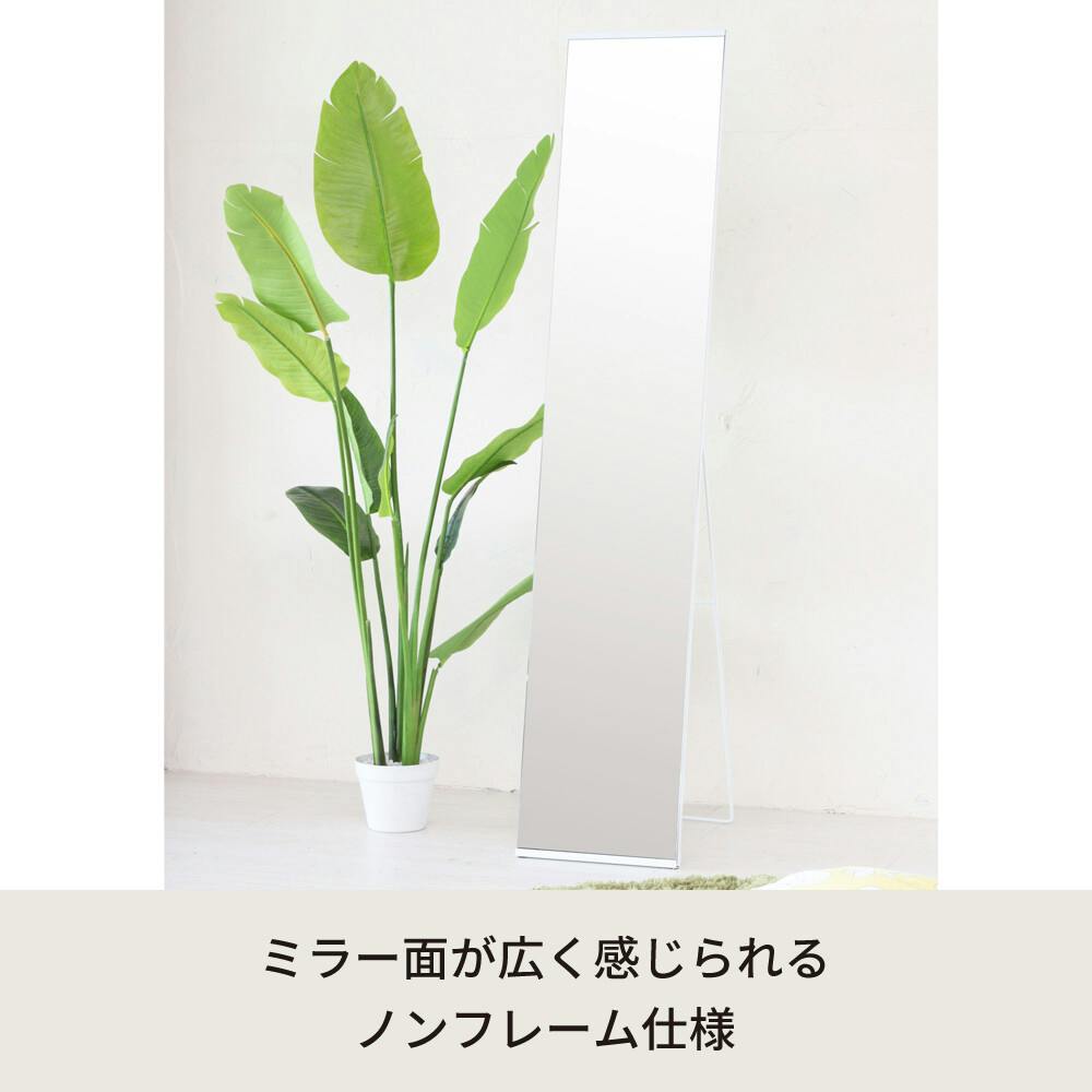 無駄のないシンプルなデザインが魅力 ノンフレームスタンドミラー。 左右にフレームがなく全面が鏡になっているので。 コーディネートチェックやヨガや着付けにも最適。 ノンフレームなのでお部屋がすっきり見えて、どこか洗練された印象を与えます。 使わないときは折りたたんですき間収納可能です。
