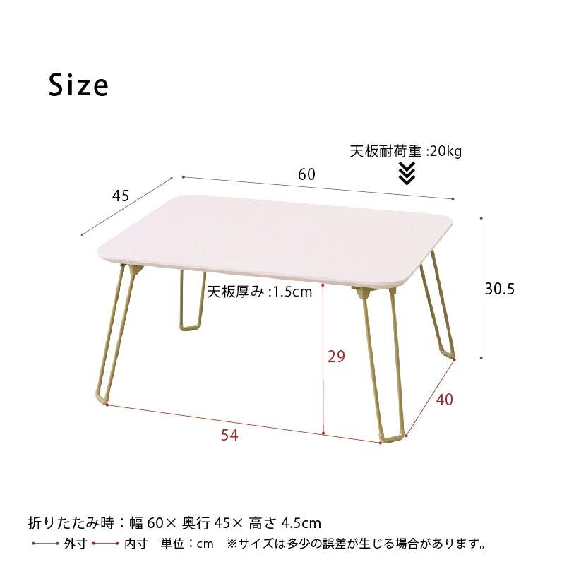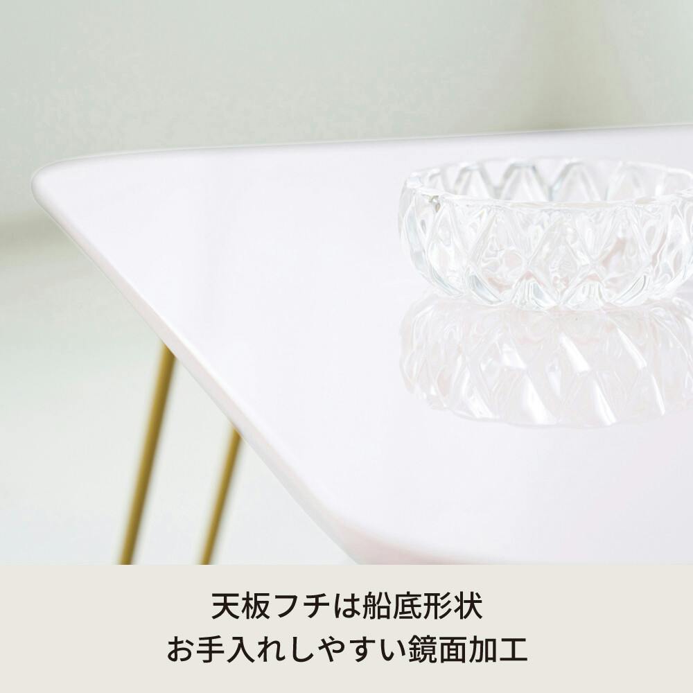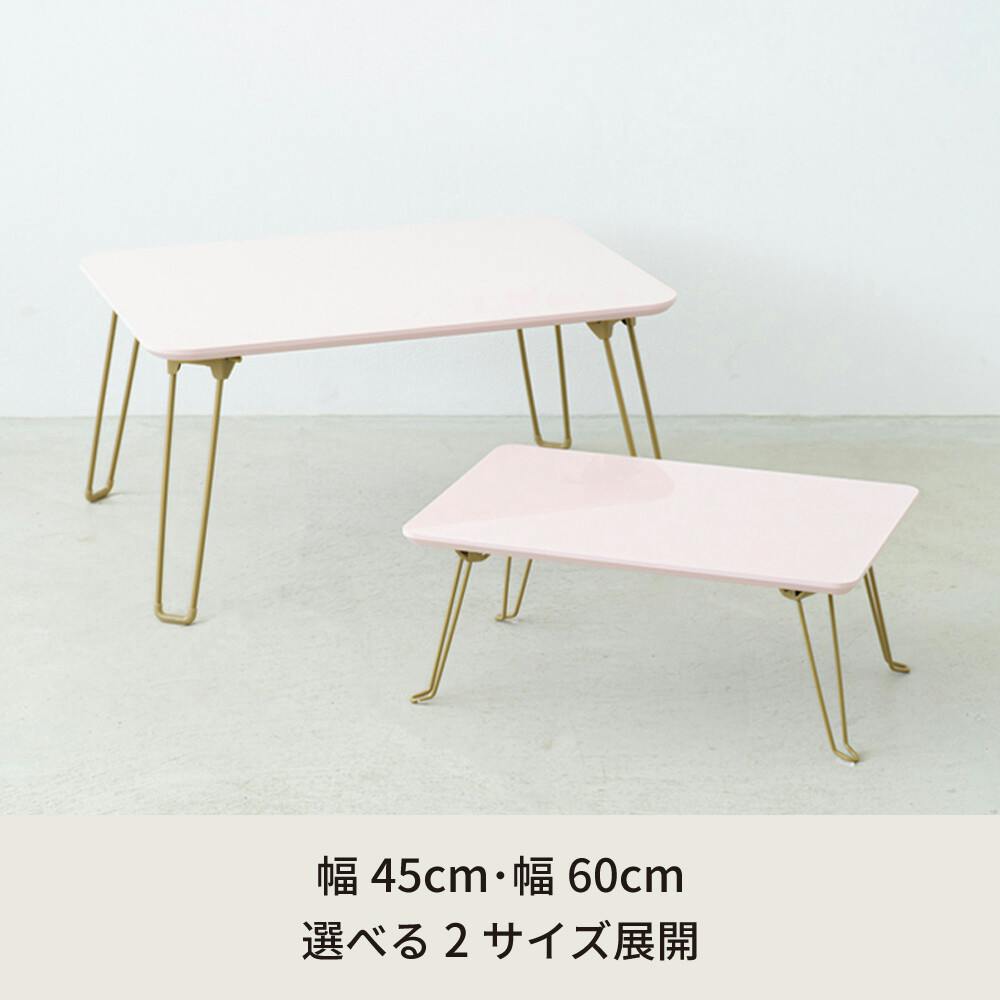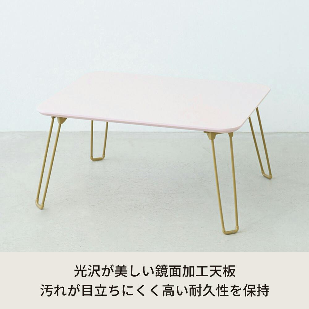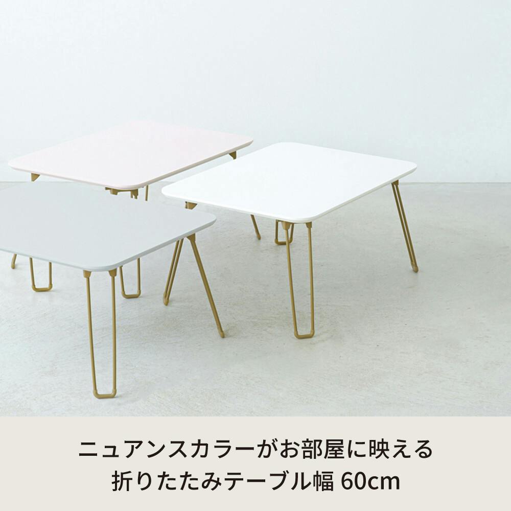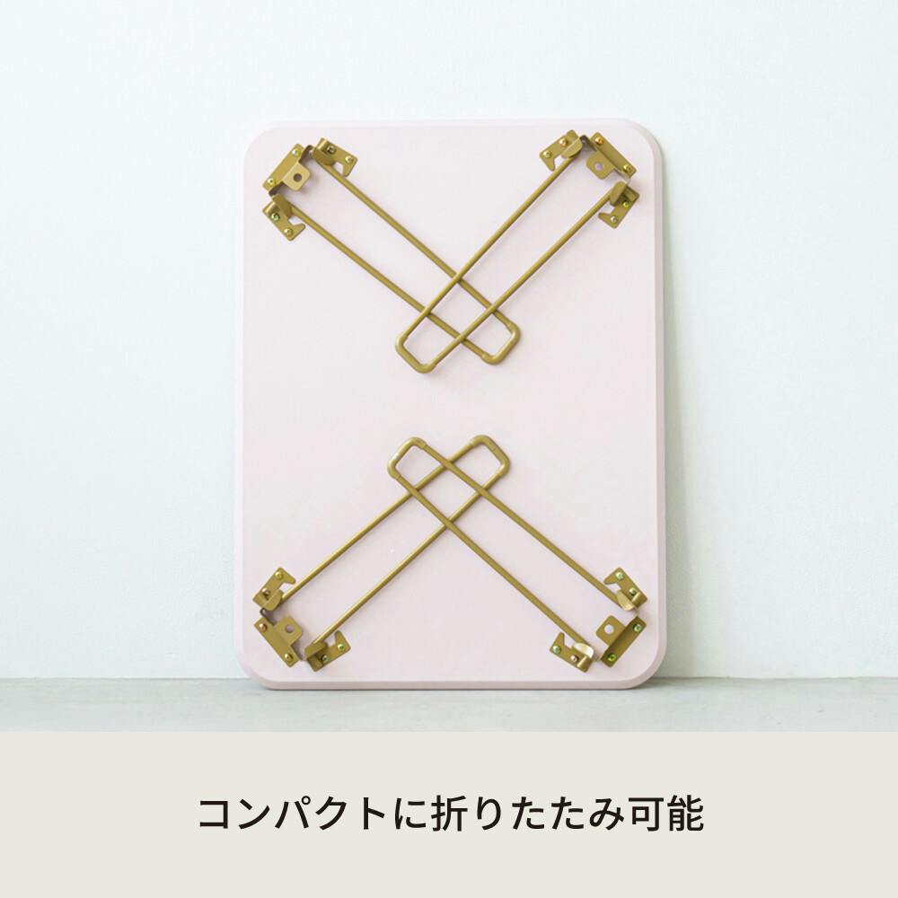ニュアンスカラーがお部屋に映える。 幅60センチ 折りたたみテーブル。 ニュアンスカラーとゴールドを組み合わせた。 控えめな色味が大人女子の心をくすぐるデザイン。 コーディネート次第で大人っぽいも可愛いも叶える空間に。 天板は鏡面加工で、置くものを美しく反射して耐久性に優れ、汚れが目立ちにくいメリットも◎。 急な来客時にさっと使えて便利なコンパクトサイズ。 使わない時は折りたたんでスリムに収納出来る折りたたみ式。