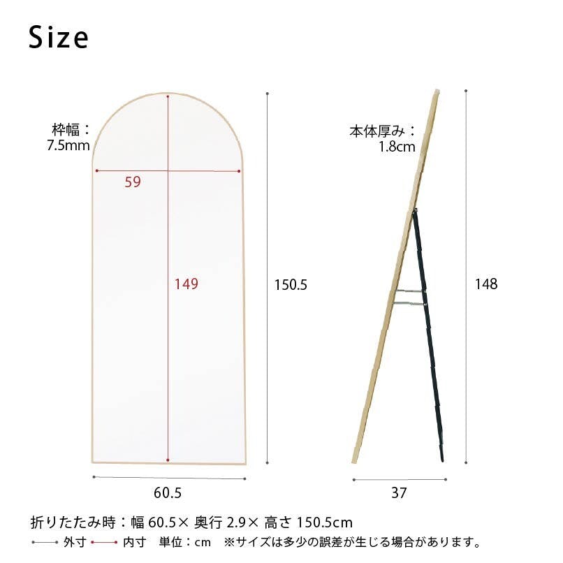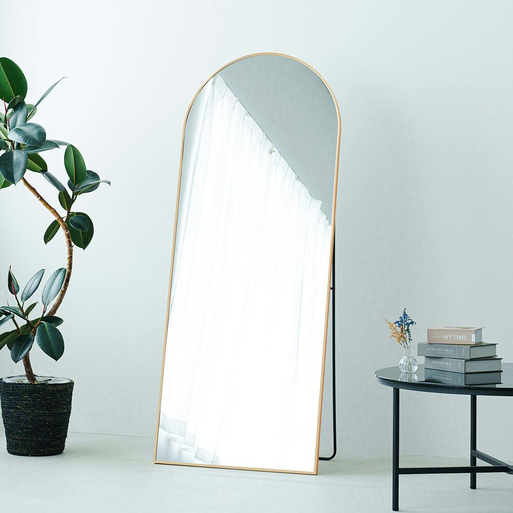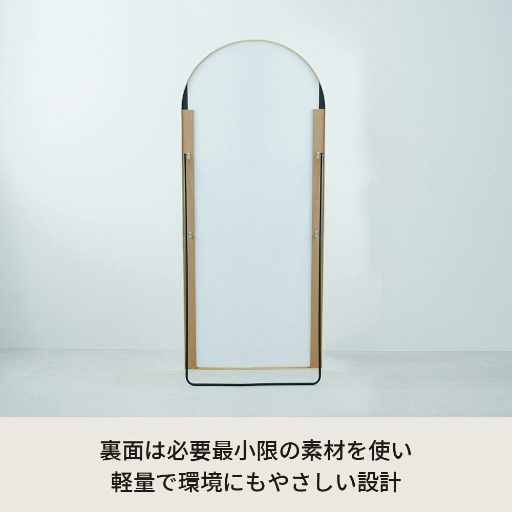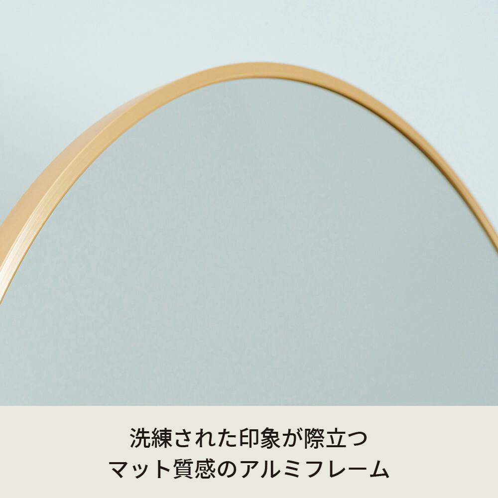 繊細なフレームラインが印象的な。 アーチ型スタンドミラー ルーミー。 幅60cmのミラーはひとりでゆったり使うのはもちろん、ご家族やパートナーと並んで使うのにもぴったり。 また光や景色をやさしく映す鏡面は。 お部屋を広く、明るく見せてくれます。 アルミフレームは上品でマットな質感。 主張しすぎず、どんなインテリアにも自然にマッチ。
