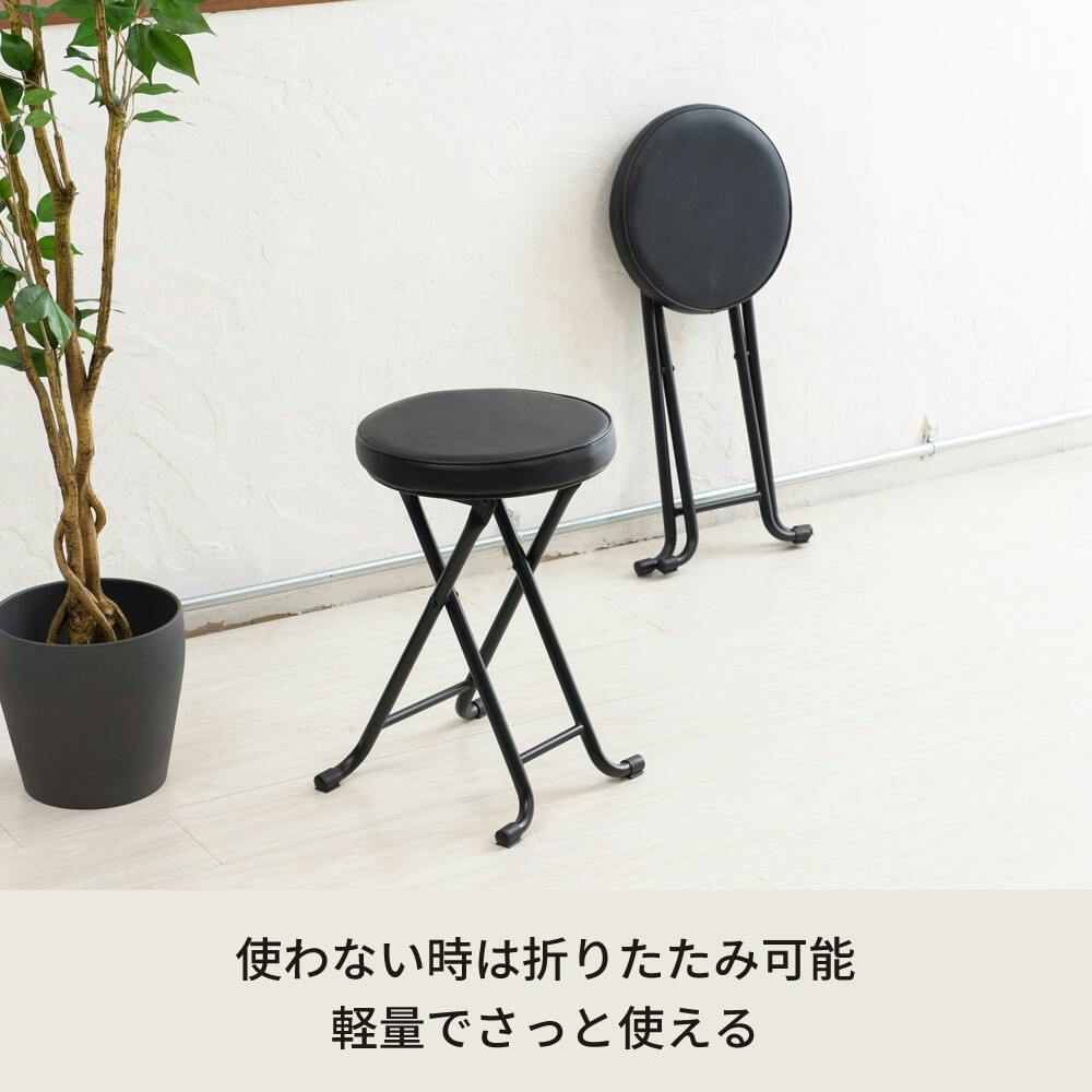 柔らかな座り心地、モノトーンカラーの折りたたみスツール。 レザー調のシートにマットな質感のスチールを組み合わせてスタイリッシュに。 場所を選ばず様々なシーンで使えるようデザインにもこだわりました。 オールブラック/オールホワイトのモダンなカラーリングはお部屋を。 すっきりとした表情にしてくれます。 柔らかいクッションはゆったり ぜいたくな座り心地で、長時間の作業やちょっとした休憩にもぴったり。