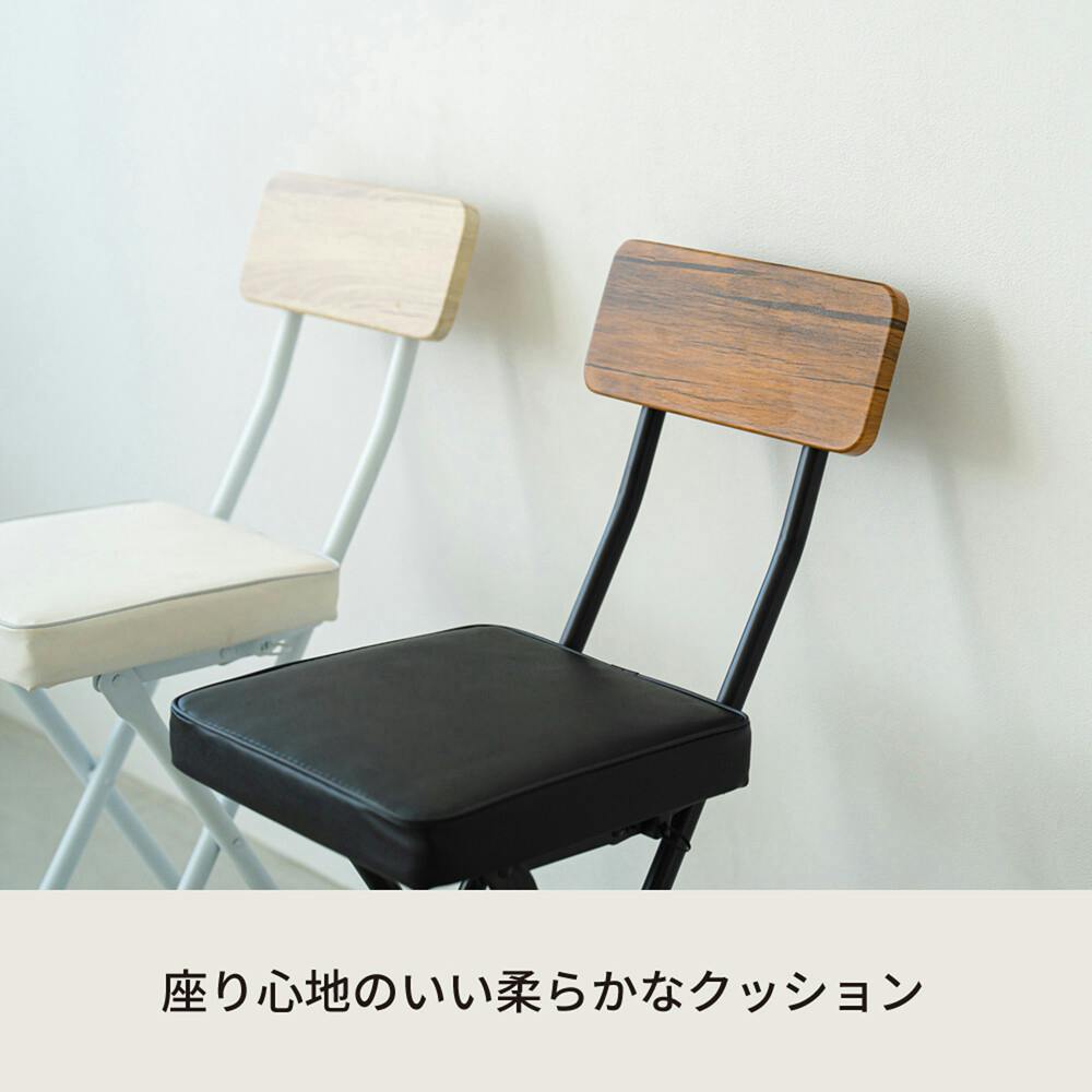 木目+レザー調のお洒落な折りたたみチェア。 異素材を組み合わせたラフでヴィンテージな風合い。 場所を選ばず様々なシーンで使えるようデザインにもこだわりました。 座面・背もたれをスクエア型にすることですっきり美しい見栄えに。 柔らかいクッションはゆったり ぜいたくな座り心地で、長時間の作業やちょっとした休憩にもぴったり。