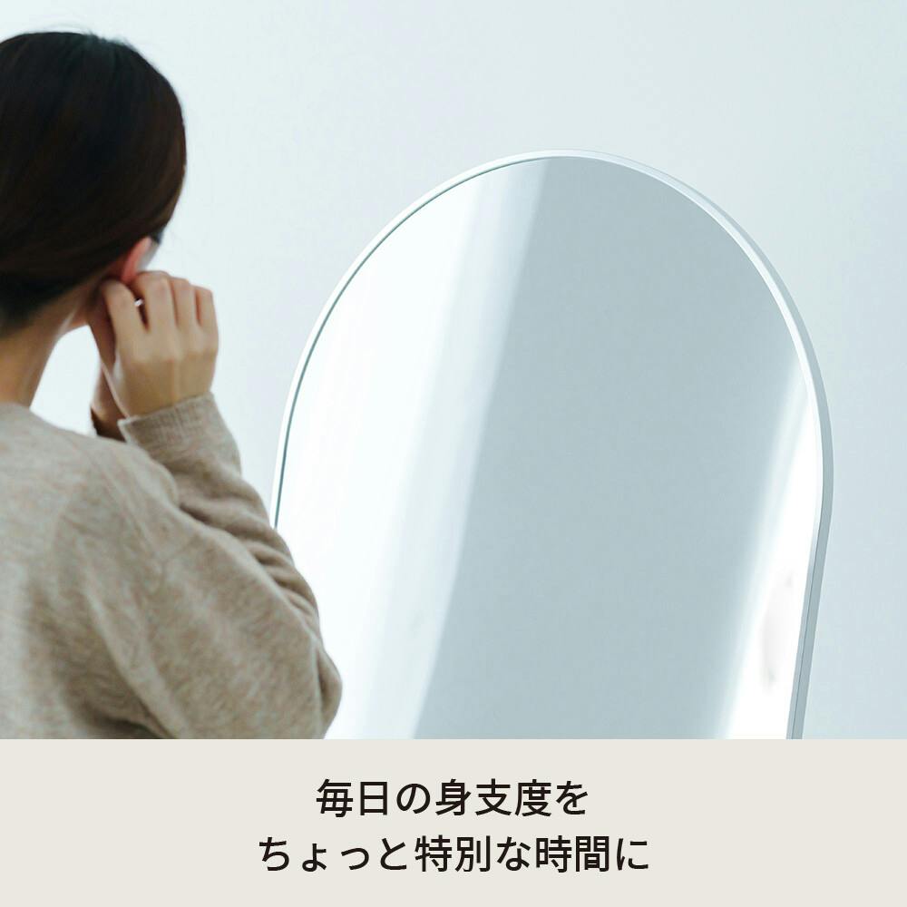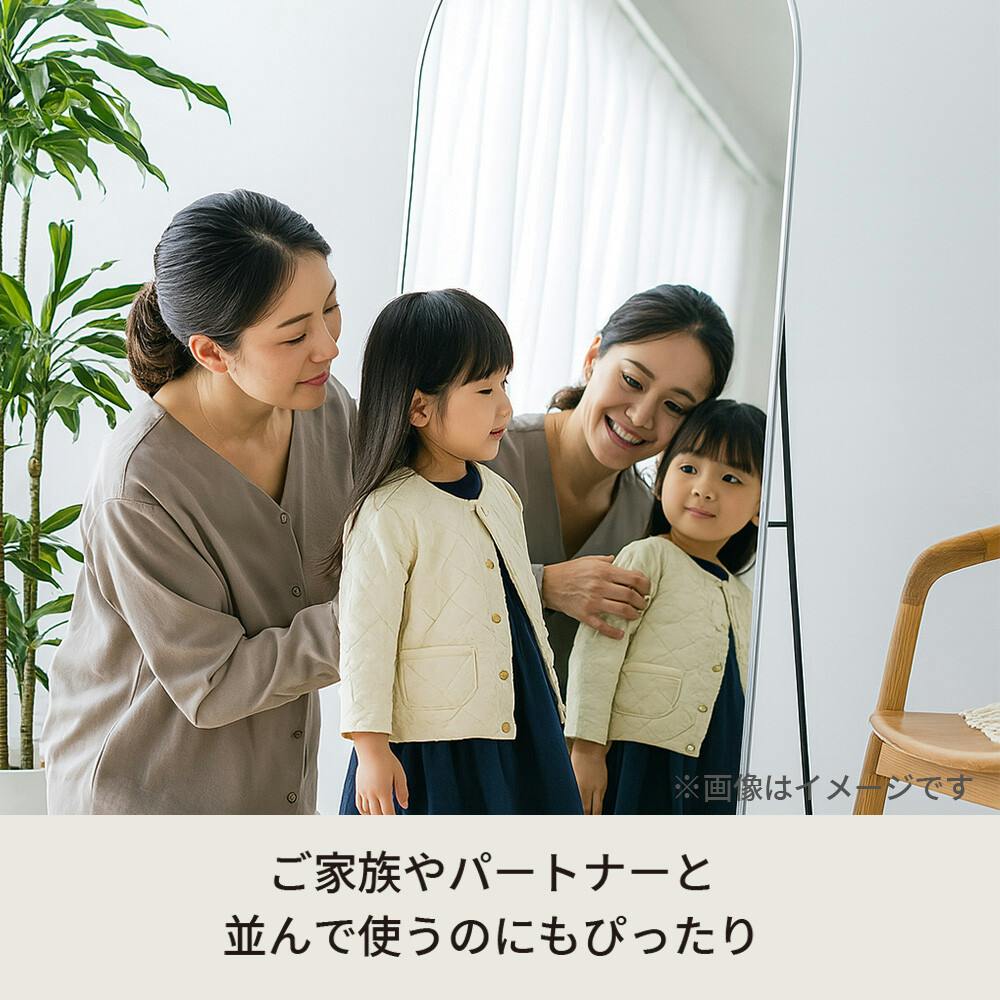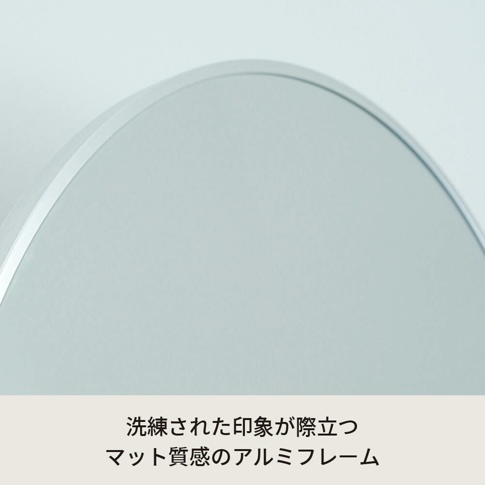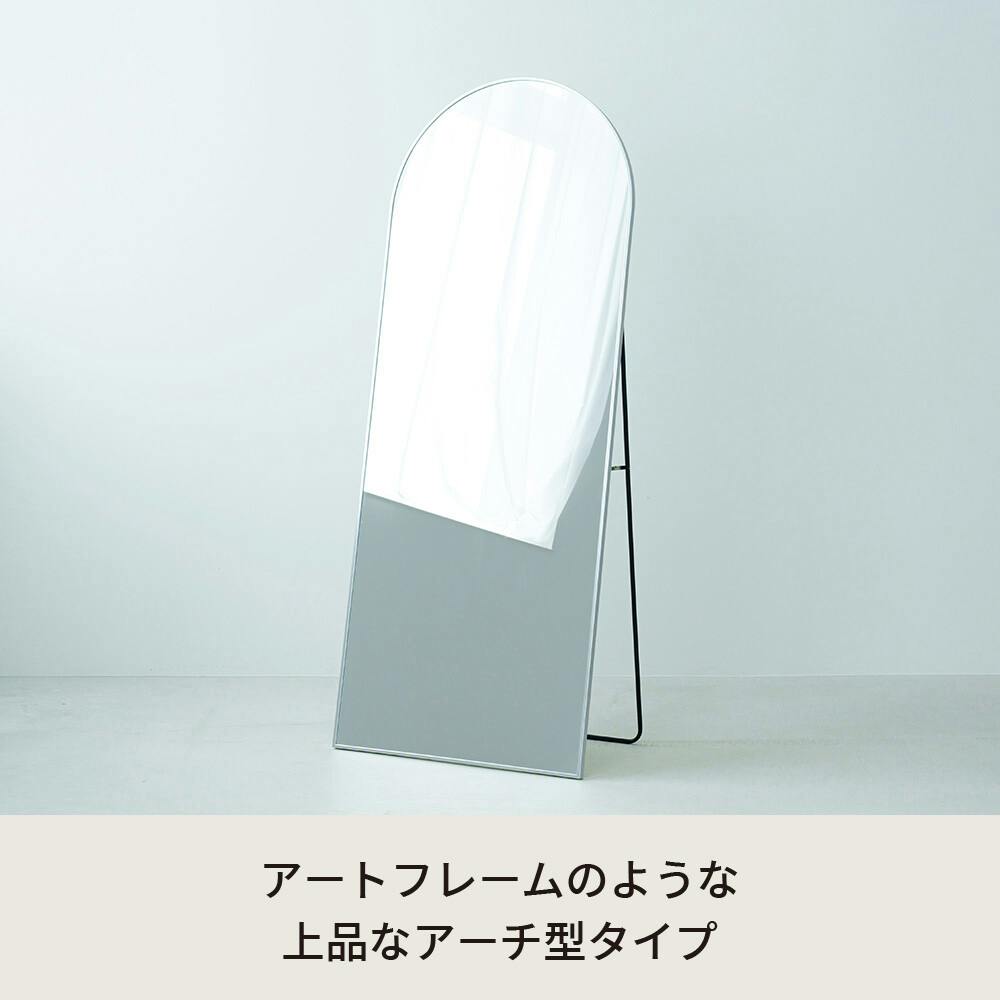 繊細なフレームラインが印象的な。 アーチ型スタンドミラー ルーミー。 幅60cmのミラーはひとりでゆったり使うのはもちろん、ご家族やパートナーと並んで使うのにもぴったり。 また光や景色をやさしく映す鏡面は。 お部屋を広く、明るく見せてくれます。 アルミフレームは上品でマットな質感。 主張しすぎず、どんなインテリアにも自然にマッチ。