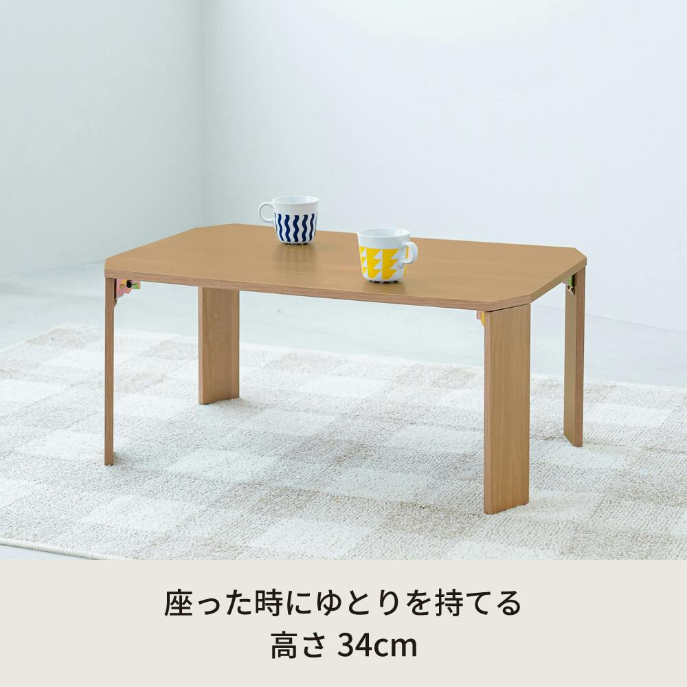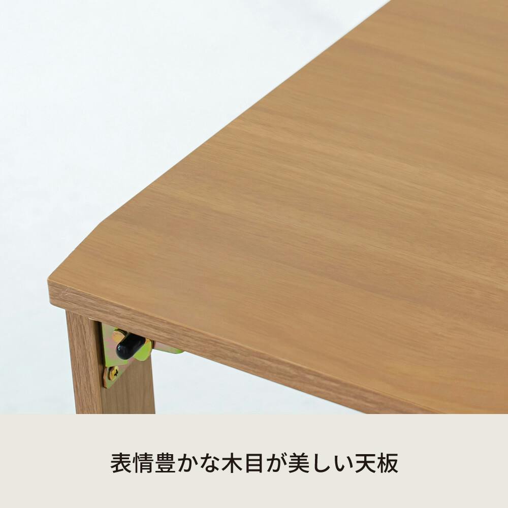 マイルドなやさしい色合い。 生活に溶け込むライフテーブル。 ナチュラルな木目調の折りたたみテーブル。 木の風合いを再現した木目調シートは。 くすみのあるマットな質感で大人っぽい印象に。 天板も脚も同素材のすっきりとしたデザイン。 床に座って使うのも、ソファ前でも使いやすい天板高34cm。 使わない時は折りたたんで収納できます。 幅60・75・80cmから選べる3サイズ。 ニーズに合った使い方をお楽しみください。 ※木目や節の柄には個体差がございます。