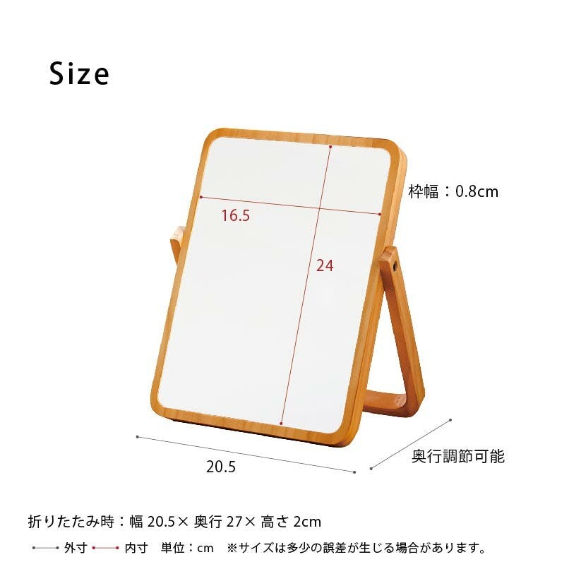 木の質感を生かしたナチュラルデザインの木製卓上ミラー。 フレームにはパイン材を使用し、天然木の質感・色味・触り心地をそのまま楽しめます。 裏面も全面木目仕様で折りたたみ時もすっきり美しい見栄え。 インテリアに溶け込む木の柔らかい色合いは。 ナチュラルや韓国インテリアが好みの方におすすめなデザイン。 スキンケアやメイクにちょうどいい大きめのサイズ感です。