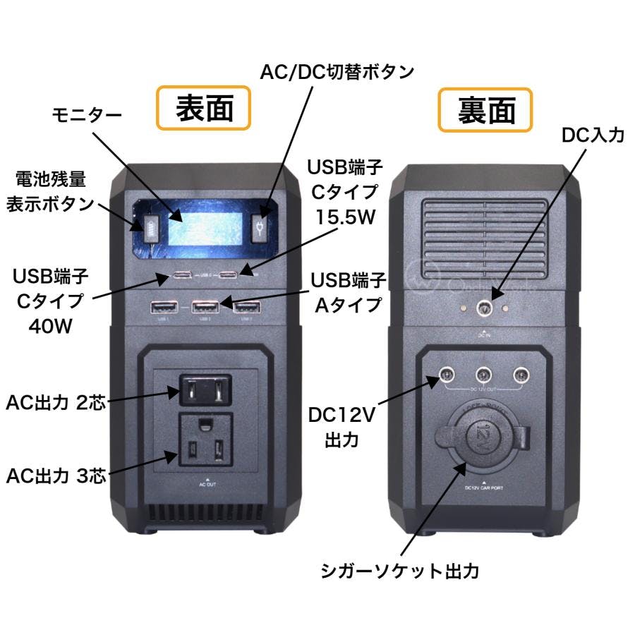 【AC】AC100V×2 【DC】USB-C(40W)×1、USB-C(15.5W)×1、USB×3、DC端子×3、DCカープラグ:×1