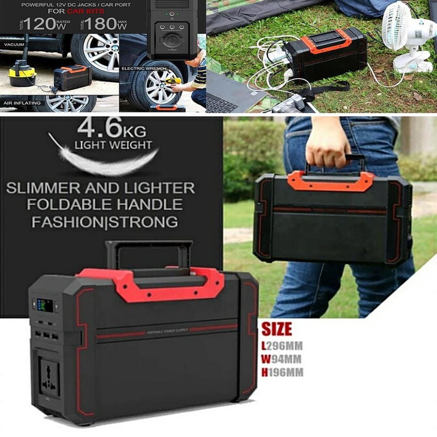 ●電源の無い屋外、アウトドアに活躍●発電機のような騒音がないので様々なシーンで活躍●持ち手あり 移動楽々●安全性の高い 多くの保護回路●大容量リチウムバッテリー:120000mAh●最大出力 AC100V-500W●AC100V出力 2端子●多彩なDC出力●USB出力端子 5V-3.1A●ACアダプター、カープラグケーブルや市販のソーラーパネルから充電可能