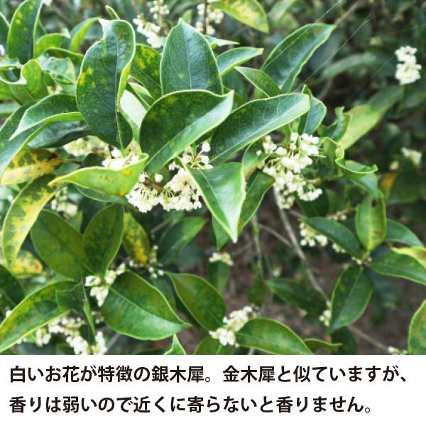 9~10月頃に白のお花を咲かせます。キンモクセイよりも花数が少なく、香りも少な目です