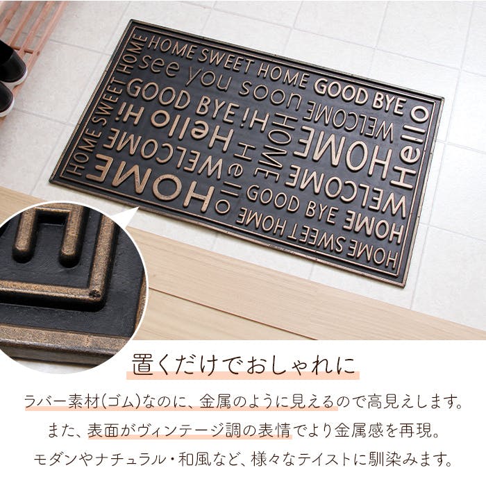 玄関をおしゃれに演出できる、アンティーク調のラバーマットです。耐久性に優れたラバー素材を使用しており、水や汚れにも強く、毎日の出入りを安心・快適にサポートします。裏面は滑り止め加工が施されているため、マットがずれにくく安全です。玄関を清潔に保ちつつ、足元にやさしいクッション性をプラスします。※お使いのモニターの環境により、実際のものと色が異なって見える場合がございます。