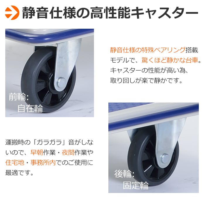 静音仕様の特殊ベアリングを搭載し、運搬時の「ガラガラ」音を大幅に軽減したスチール台車。早朝・夜間作業や住宅地、事務所内でも安心して使用できます。ハンドルを折りたたむことができるので、使わない時はコンパクトに収納が可能。大型車輪だから操縦性も抜群です。