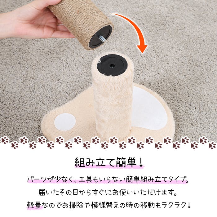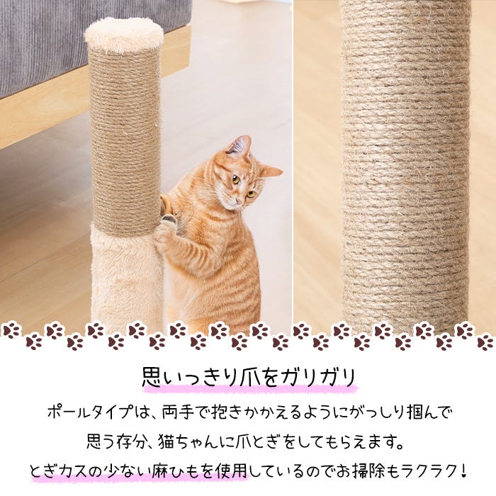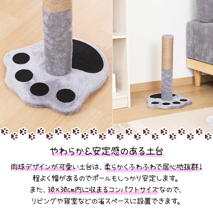 思いっきり爪をガリガリできる!ポール型の猫用爪とぎ。安定感のある土台は、愛らしい肉球モチーフ。爪とぎの機能性に加えて、お部屋のアクセントとしても活躍します。のびのびと爪を研いだり背伸びしてストレッチを楽しんだりする姿も見られます。