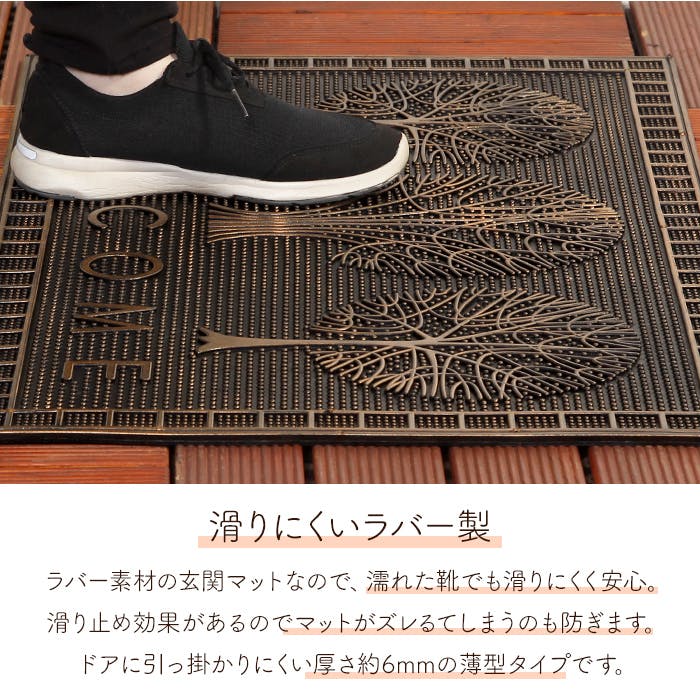 玄関をおしゃれに演出できる、アンティーク調のラバーマットです。耐久性に優れたラバー素材を使用しており、水や汚れにも強く、毎日の出入りを安心・快適にサポートします。裏面は滑り止め加工が施されているため、マットがずれにくく安全です。玄関を清潔に保ちつつ、足元にやさしいクッション性をプラスします。※お使いのモニターの環境により、実際のものと色が異なって見える場合がございます。